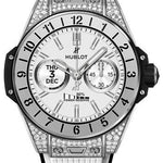 42 mm satin-finished and polished titanium case set with 108 diamonds for 1.19 cts, sapphire crystal with anti-reflective treatment, digital hublot dial, Qualcomm® movement, approximately around 1 day of power reserve, black and white structured lined rubber strap, titanium deployant buckle. Water resistant to 30m (3 ATM).