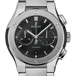 42 mm satin-finished and polished titanium case, satin-finished and polished titanium bezel with 6 h-shaped titanium screws, sapphire crystal with anti-reflective treatment, matte black dial, HUB4302 self-winding chronograph movement, approximately 42 hours of power reserve, satin-finished and polished titanium bracelet, titanium deployant buckle. Water resistant to 50m (5 ATM).