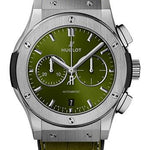 42 mm satin-finished and polished titanium case, satin-finished and polished titanium bezel with 6 h-shaped titanium screws, sapphire crystal with anti-reflective treatment, satin-finished green sunray dial, HUB1153 self-winding chronograph movement, approximately 42 hours of power reserve, black rubber and green alligator leather strap, stainless steel deployant buckle. Water resistant to 50m (5 ATM).