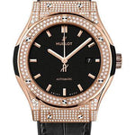 42 mm polished 18k king gold case set with 228 diamonds totaling 1.20cts, polished 18K king gold bezel set with 138 diamonds totaling 1.01cts with, 6 H-shaped titanium screws, sapphire crystal with anti-reflective treatment, matte black dial, HUB1110 self-winding movement, approximately 42 hours of power reserve, black rubber and alligator leather strap, 18K king gold and black pvd stainless steel deployant buckle. Water resistant to 50m (5 ATM).
