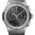 42 mm satin-finished and polished titanium case, satin-finished and polished titanium bezel with 6 h-shaped titanium screws, sapphire crystal with anti-reflective treatment, satin-finished gray sunray dial, HUB1153 self-winding chronograph movement, approximately 42 hours of power reserve, gray lined rubber strap, stainless steel deployant buckle. Water resistant to 50m (5 ATM).