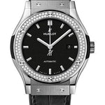 42 mm satin-finished and polished titanium case, polished titanium bezel set with 138 diamonds totaling 1.01cts with, 6 H-shaped titanium screws, sapphire crystal with anti-reflective treatment, matte black dial, HUB1110 self-winding movement, approximately 42 hours of power reserve, black rubber and alligator leather strap, stainless steel deployant buckle. Water resistant to 50m (5 ATM).