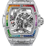 42 mm polished sapphire crystal case, polished 18K white gold bezel set with 54 baguette-cut colored gemstones: rubies, pink sapphires, amethysts, blue sapphires, blue topazes, tsavorites, yellow sapphires and orange sapphires, sapphire crystal with anti-reflective treatment, matte white dial, HUB6020 manufacture manual-winding power reserve skeleton tourbillon movement, approximately 115 hours of power reserve, transparent structured lined strap, titanium deployant buckle. Water resistant to 30m (3 ATM).