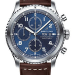 43.00 mm steel case, 14.17 mm thick, screw-locked crown with two gaskets, bidirectional bezel, cambered sapphire crystal with glareproof treatment on both sides, blue dial, Breitling 13 self-winding movement with date in dial aperture and chronograph function, approximately 48 hours of power reserve, brown leather strap, tang buckle. Water resistant to 100 m (330 ft).