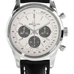 43.00mm stainless steel case, transparent sapphire crystal back, convex sapphire crystal with glareproof treatment on both sides, mercury silver dial, selfwinding mechanical Breitling 01 movement with date display, chronograph function, 70 hours of power reserve, black leather strap with deployant buckle. Water resistant to 100 m (330 ft).