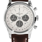 43.00mm stainless steel case, transparent sapphire crystal back, convex sapphire crystal with glareproof treatment on both sides, mercury silver dial, selfwinding mechanical Breitling 01 movement with date display, chronograph function, 70 hours of power reserve, brown leather strap with deployant buckle. Water resistant to 100 m (330 ft).