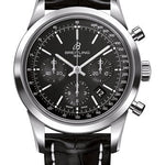 43.00 mm steel case, 14.35 mm thick, transparent sapphire crystal back, non screw-locked crown with two gaskets, convex sapphire crystal with glareproof treatment on both sides, black dial, Breitling 01 (Manufacture) self-winding movement, approximately 70 hrs of power reserve, black croco strap, tang buckle. Water resistant to 100 m (330 ft).