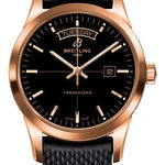 43.00 mm 18K red gold case, 12.80 mm thick, non screw-locked crown with two gaskets, convex sapphire crystal with glareproof treatment on both sides, black dial, Breitling 45 self-winding movement, approximately 40 hours of power reserve, black rubber aero classic strap. Water resistant to 100 m (330 ft).