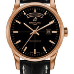 43.00 mm 18K red gold case, screwed in back, non screw-locked crown with two gaskets, convex sapphire crystal with glareproof treatment on both sides, black dial, selfwinding mechanical Breitling 45 movement with date at 3 o'clock and day at 12 o'clock, approximately 42 hours of power reserve, black croco strap with deployant buckle. Water resistant to 100 m (330 ft).