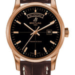 43.00 mm 18K red gold case, screwed in back, non screw-locked crown with two gaskets, convex sapphire crystal with glareproof treatment on both sides, black dial, selfwinding mechanical Breitling 45 movement with date at 3 o'clock and day at 12 o'clock, approximately 42 hours of power reserve, brown croco strap with deployant buckle. Water resistant to 100 m (330 ft).
