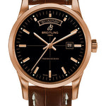 43.00 mm 18K red gold case, screwed in back, non screw-locked crown with two gaskets, convex sapphire crystal with glareproof treatment on both sides, black dial, selfwinding mechanical Breitling 45 movement with date at 3 o'clock and day at 12 o'clock, approximately 42 hours of power reserve, gold croco strap with deployant buckle. Water resistant to 100 m (330 ft).