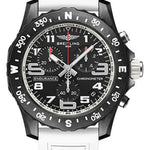 44.0 mm Breitlight® case, 12.5 mm thick, non screw-locked crown with two gaskets, bidirectional compass scale bezel, black dial, Breitling 82 thermocompensated SuperQuartz™ movement, white rubber strap, tang buckle. Water resistant to 100 m (330 ft).