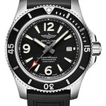 steel case, screw-locked crown with two gaskets, cambered sapphire crystal with glareproof treatment on both sides, black dial, Breitling 17 self-winding movement, approximately 38 hrs of power reserve, black diver pro III strap, tang buckle.