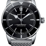 44.00 mm steel case, 14.55 mm thick, screw-locked crown with two gaskets, unidirectional ratcheted bezel, cambered sapphire crystal with glareproof treatment on both sides, black dial, Breitling 20 self-winding movement with calendar via dial aperture and chronograph function, approximately 70 hours of power reserve, steel Aero Classic bracelet. Water resistant to 200 m (660 ft).
