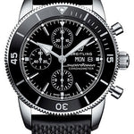 44.00 mm steel case, 15.65 mm thick, screw-locked crown with two gaskets, unidirectional ratcheted bezel, cambered sapphire crystal with glareproof treatment on both sides, black dial, Breitling 13 self-winding movement with calendar via dial aperture and chronograph function, approximately 48 hours of power reserve, black rubber aero classic strap, pushbutton folding buckle. Water resistant to 200 m (660 ft).