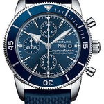 44.00 mm steel case, 15.65 mm thick, screw-locked crown with two gaskets, unidirectional ratcheted bezel, cambered sapphire crystal with glareproof treatment on both sides, blue dial, Breitling 13 self-winding movement with calendar via dial aperture and chronograph function, approximately 48 hours of power reserve, blue rubber aero classic strap, pushbutton folding buckle. Water resistant to 200 m (660 ft).