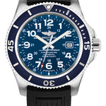 44.00 mm stainless steel case, screw-locked crown with two gaskets, unidirectional ratcheted bezel with blue rubber insert, cambered sapphire crystal with glareproof treatment on both sides, Gun blue dial, selfwinding mechanical Breitling 17 movement with date display, 40 hours of power reserve, black Diver Pro III strap with tang-type buckle. Water resistant to 1,000 m (3,300 ft).