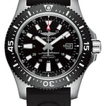 44.00 mm steel case, 14.20 mm thick, screw-locked crown with two gaskets, unidirectional ratcheted bezel, cambered sapphire crystal with glareproof treatment on both sides, volcano black dial, Breitling 17 self-winding movement, approximately 38 hrs of power reserve, black ocean racer II strap, tang buckle. Water resistant to 1,000 m (3,300 ft).