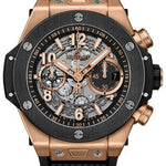 44 mm polished and satin-finished 18k king gold case, satin-finished and polished black ceramic bezel with 6 h-shaped titanium screws, sapphire crystal with anti-reflective treatment, matte black skeleton dial, HUB1280 UNICO manufacture self-winding chronograph flyback movement, approximately 72 hours of power reserve, black structured lined rubber strap, 18K king gold and black pvd titanium deployant buckle. Water resistant to 100m (10 ATM).