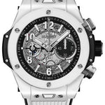 44 mm microblasted and polished white ceramic case, microblasted and polished white ceramic bezel with 6 h-shaped titanium screws, sapphire crystal with anti-reflective treatment, matte black skeleton dial, HUB1280 UNICO manufacture self-winding chronograph flyback movement, approximately 72 hours of power reserve, black and white structured lined rubber strap, white ceramic and black-plated titanium deployant buckle. Water resistant to 100m (10 ATM).