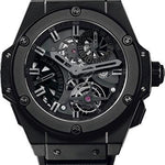 48mm black ceramic case, black ceramic and black rubber bezel, mat black dial, manual winding HUB 6121 tourbillon GMT movement with retrograde date at 9 o'clock, GMT dial at 1 o'clock in red and blud, and tourbillon cage at 5 o'clock, approximately 90 hours of power reserve, black rubber strap with deployant buckle. Water resistant to 100 meters.