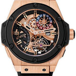 48mm 18K King Gold case, black ceramic and black rubber bezel, skeleton dial, manual winding HUB 6121 tourbillon GMT movement with retrograde date at 9 o'clock, GMT dial at 1 o'clock in red and blud, and tourbillon cage at 5 o'clock, approximately 90 hours of power reserve, black rubber strap with deployant buckle. Water resistant to 100 meters.
