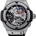 48mm zirconium case, zirconium and black rubber bezel, skeleton dial, manual winding HUB 6121 tourbillon GMT movement with retrograde date at 9 o'clock, GMT dial at 1 o'clock in red and blud, and tourbillon cage at 5 o'clock, approximately 90 hours of power reserve, black rubber strap with deployant buckle. Water resistant to 100 meters.