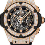 48mm 18K King Gold case set with 248 diamonds (2.05ct), sapphire crystal back, 18K King gold and black rubber bezel set with 126 diamonds (1.29ct), skeleton dial, self winding HUB 1240 Unico Skeleton movement with chronograph function, black rubber strap with deployant buckle. Water resistant to 100 meters.