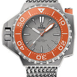 55 x 48 mm titanium case with helium escape valve, transparent back, bi-directional rotating bezel ring, flat scratch-resistant sapphire crystal anti-reflective treatment on both sides, grade 5 titanium dial with varnished orange and white hands, Caliber Omega 8912 self winding movement with co-axial escapement, chronometer, approximately 60 hours of power reserve, titanium bracelet. Water resistant to 120 bar (1200 metres / 4000 feet). Delivered in a special presentation box along with an additional grey rubber strap.
