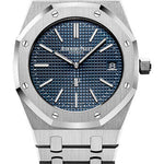 39mm x 49mm x 8.10mm stainless steel case, sapphire crystal back, screw-locked crown, glareproofed sapphire crystal, blue dial with petite tapisserie pattern, gold applied hour-markers, and Royal Oak hands with luminescent coating, self-winding Audemars Piguet Calibre 2121 movement with date, approximately 40 hours of power reserve, stainless steel bracelet. Water resistant to 50 meters.