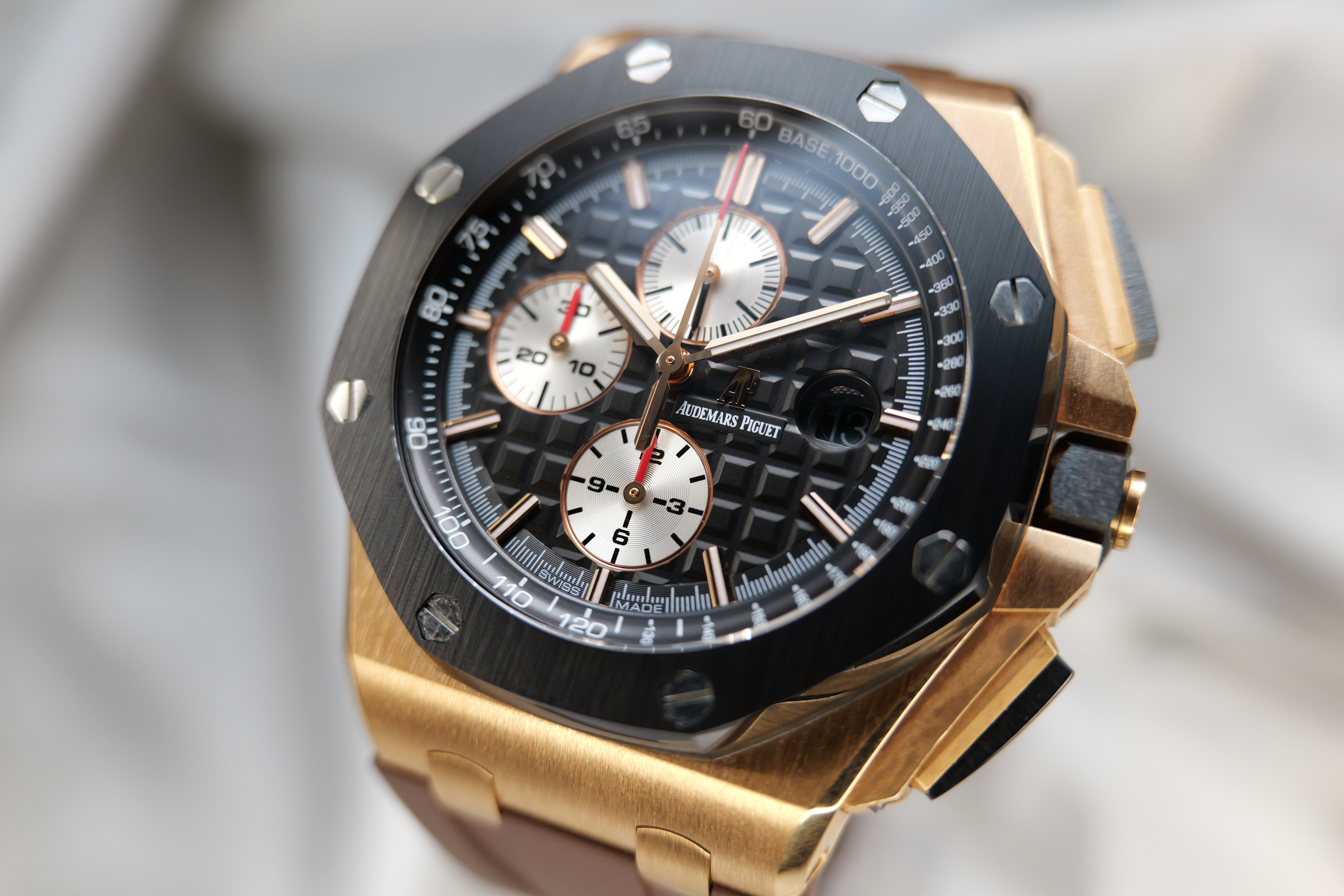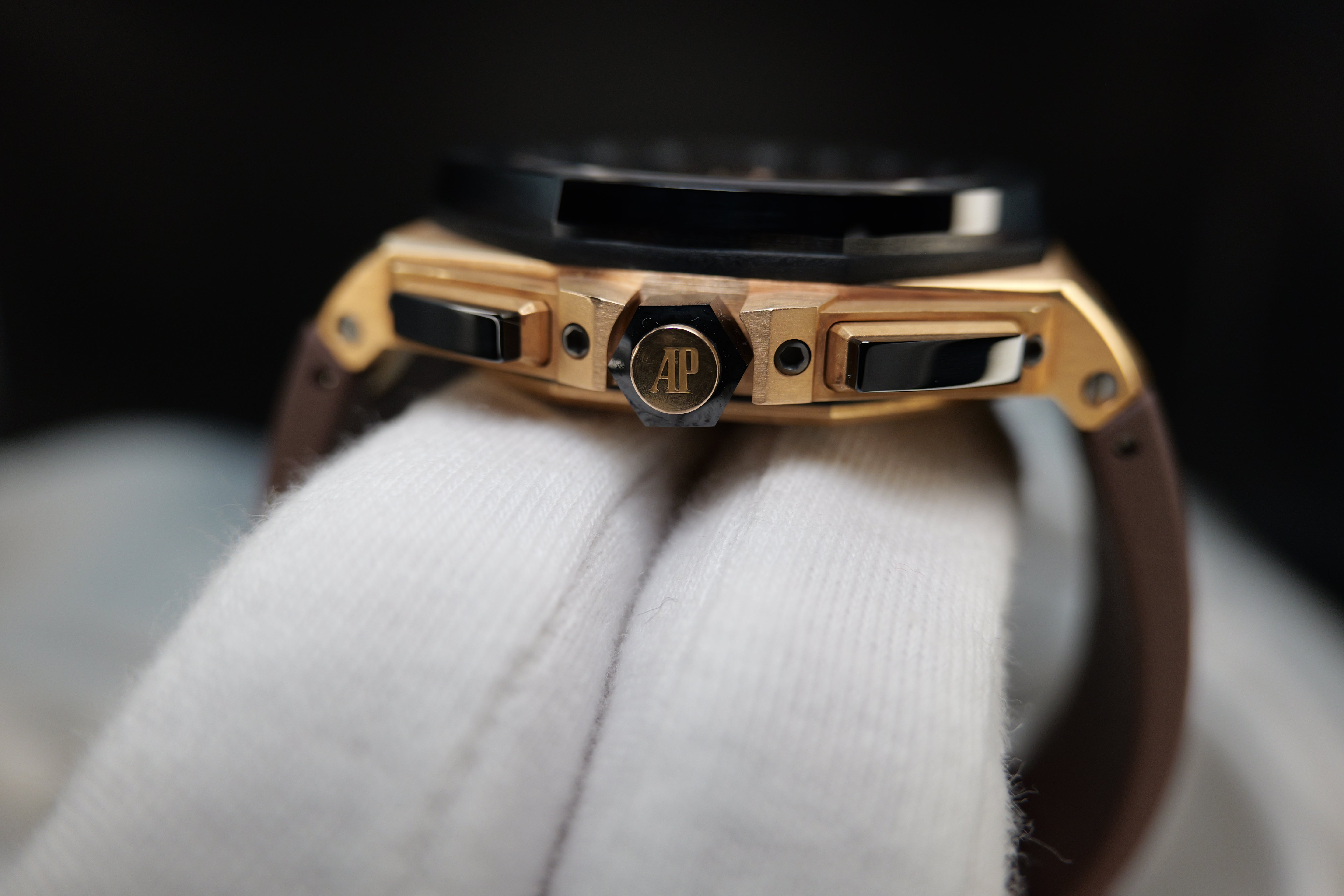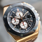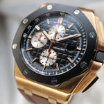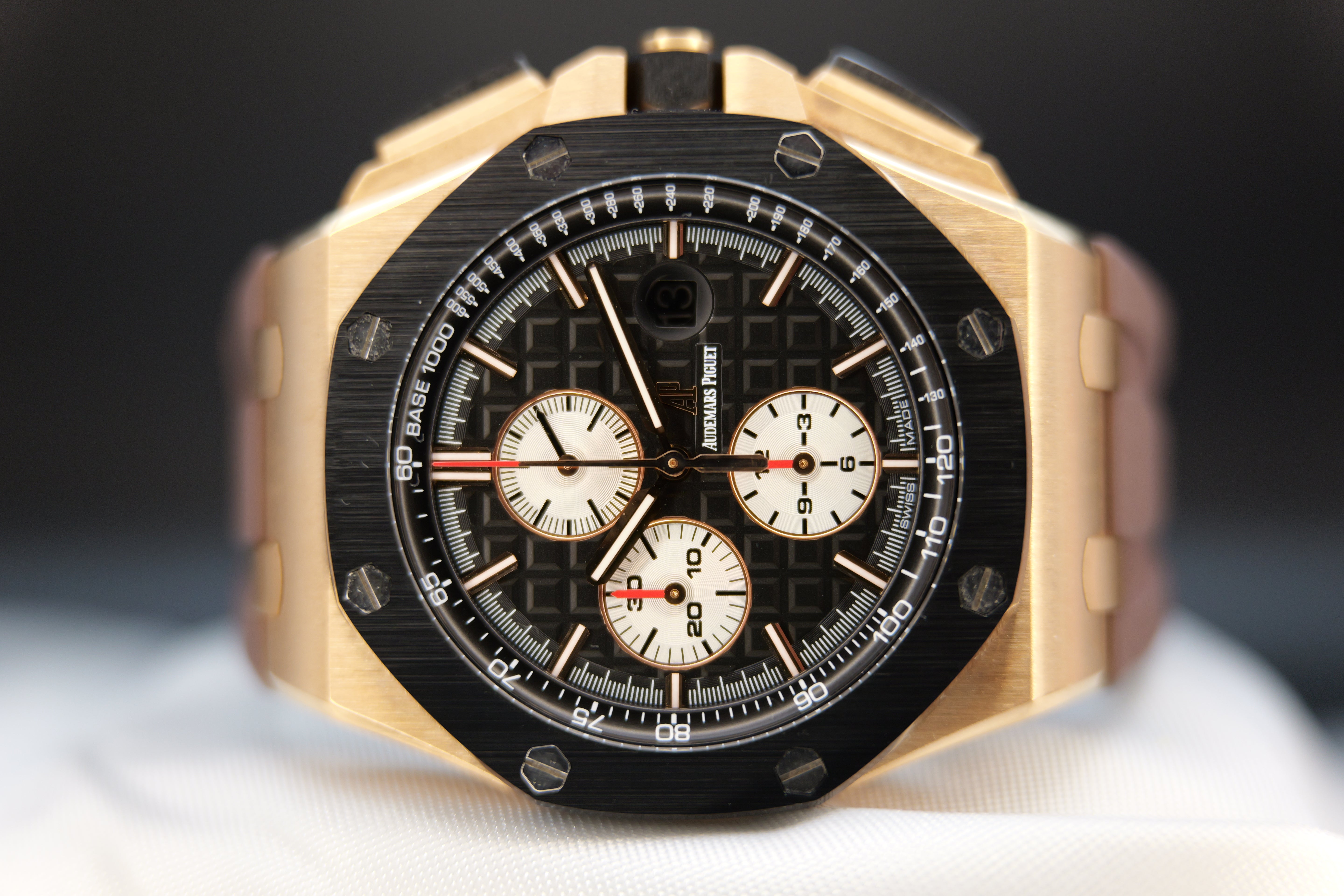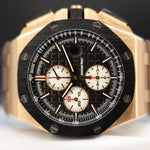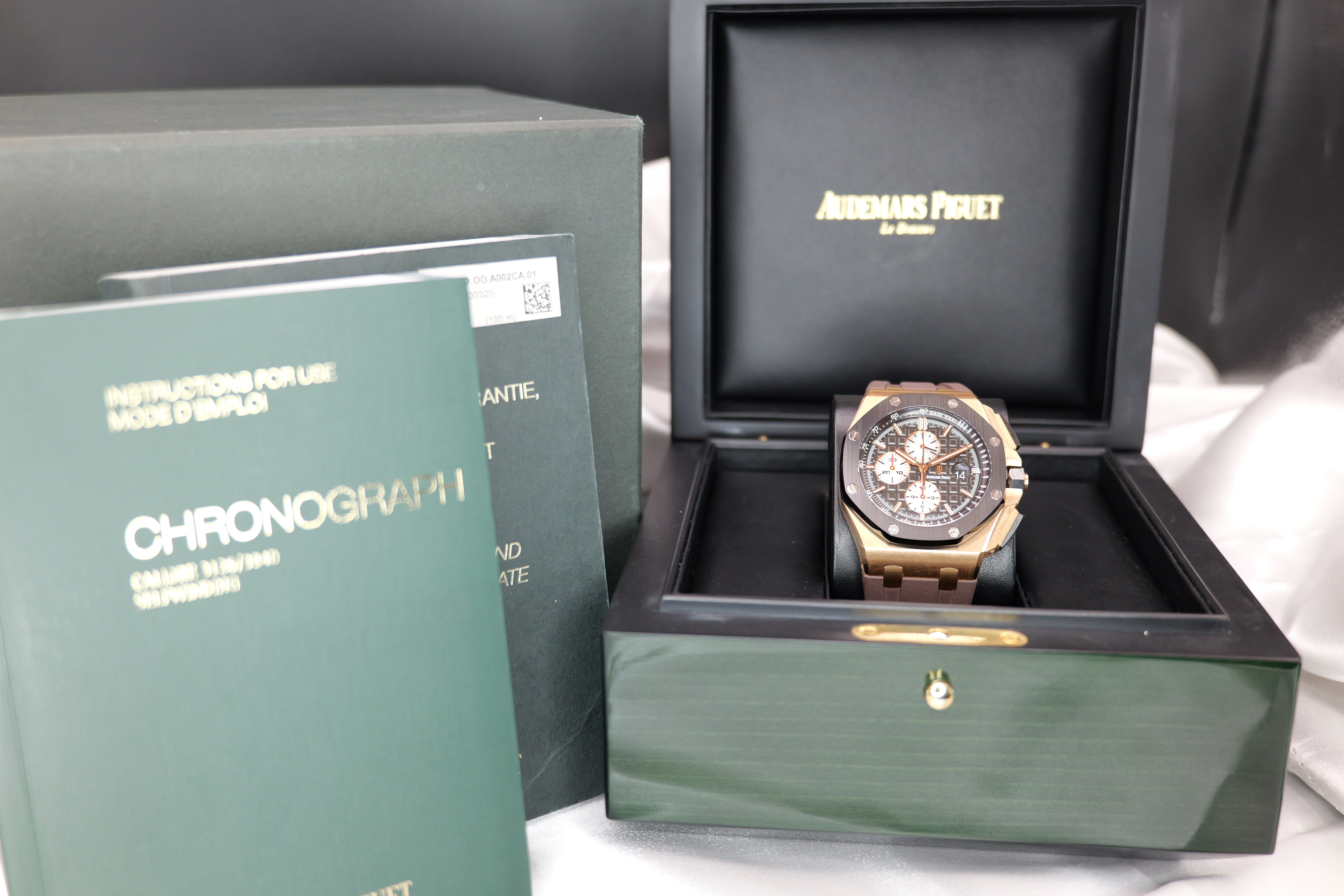 Up for sale is the Audemars Piguet Royal Oak Offshore Chronograph Black Rose Gold Black Ceramic 26401RO.OO.A002CA.01 44mm Black/White Dial with Warranty, authentication, and register certificate book Calibre 3126/3840 book and double-boxed. Watch is dated 2014. MSRP $51,600. It was recently placed on a timegrapher and is running well. All of our watches are photographed under high intensity light with a macro lens. Any flaws will be significantly magnified. The serial numbers have been blurred for privacy. Timepiece is in excellent condition showing no signs of wear. Box shows some signs of wear and functions as expected. Timepiece is located in Indiana and is located in Indiana.