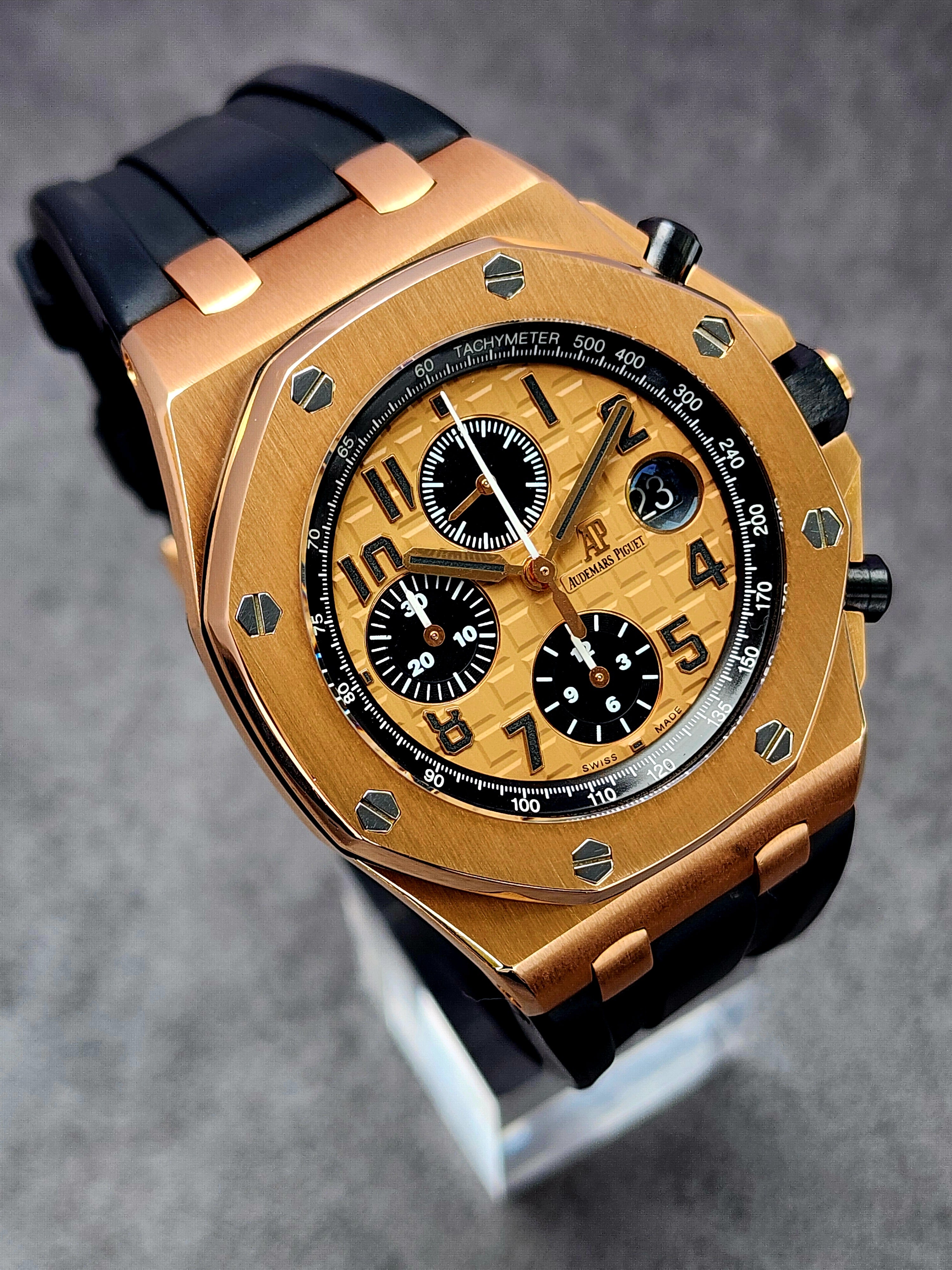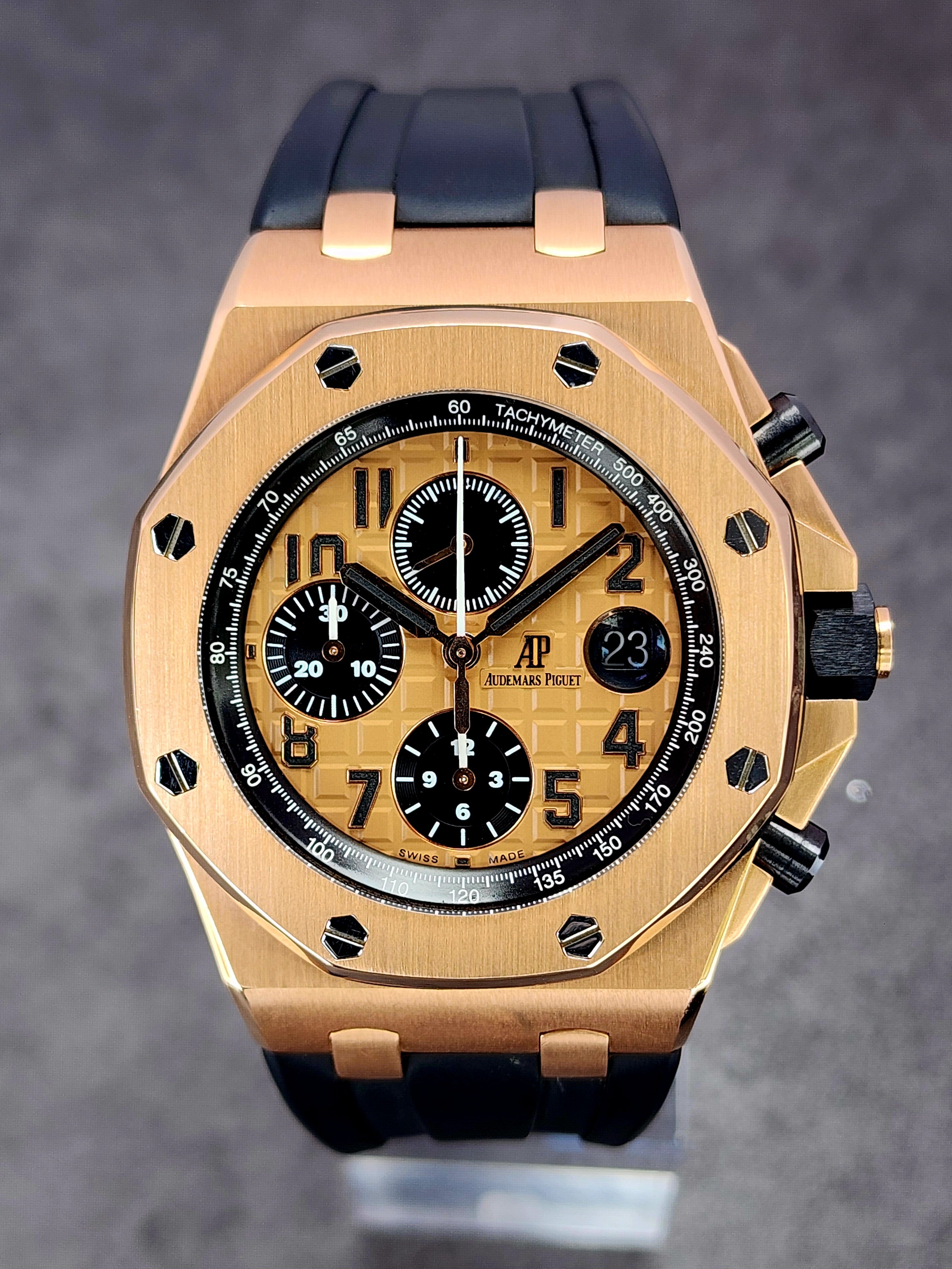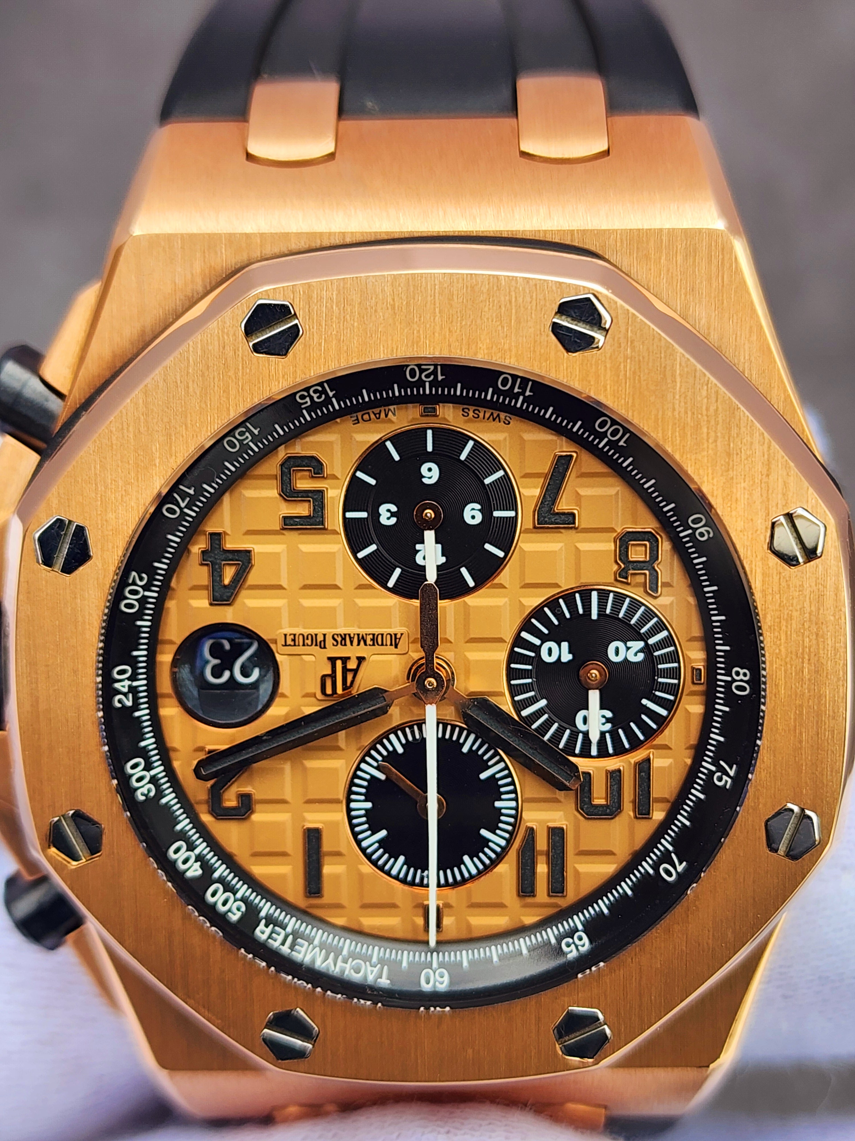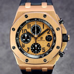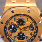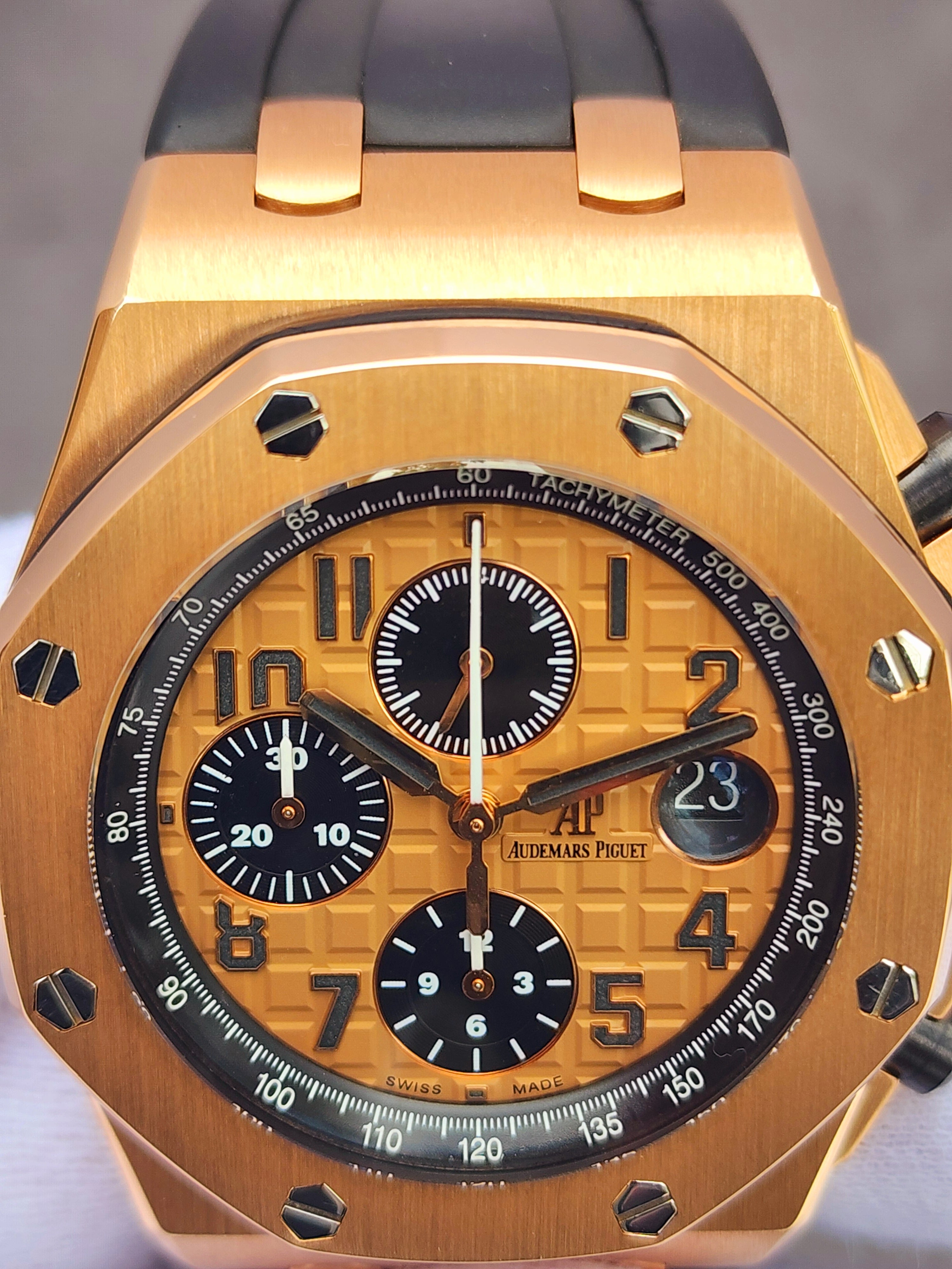 Up for sale is the Audemars Piguet Royal Oak Offshore Chronograph Half Brick 26470OR.OO.A002CR.01 42mm with AP inner- and outer-box, Calibre 3126/3840 Chronograph instructions and Warranty, Authentication, and Register Certificate. Watch is dated 2015. It was recently placed on a timegrapher and is running well. All of our watches are photographed under high intensity light with a macro lens. Any flaws will be significantly magnified. The serial numbers have been blurred for privacy. The inner-box shows some signs of wear and is functioning as expected. This timepiece is in excellent condition with little to no signs of wear and is located in Indiana.