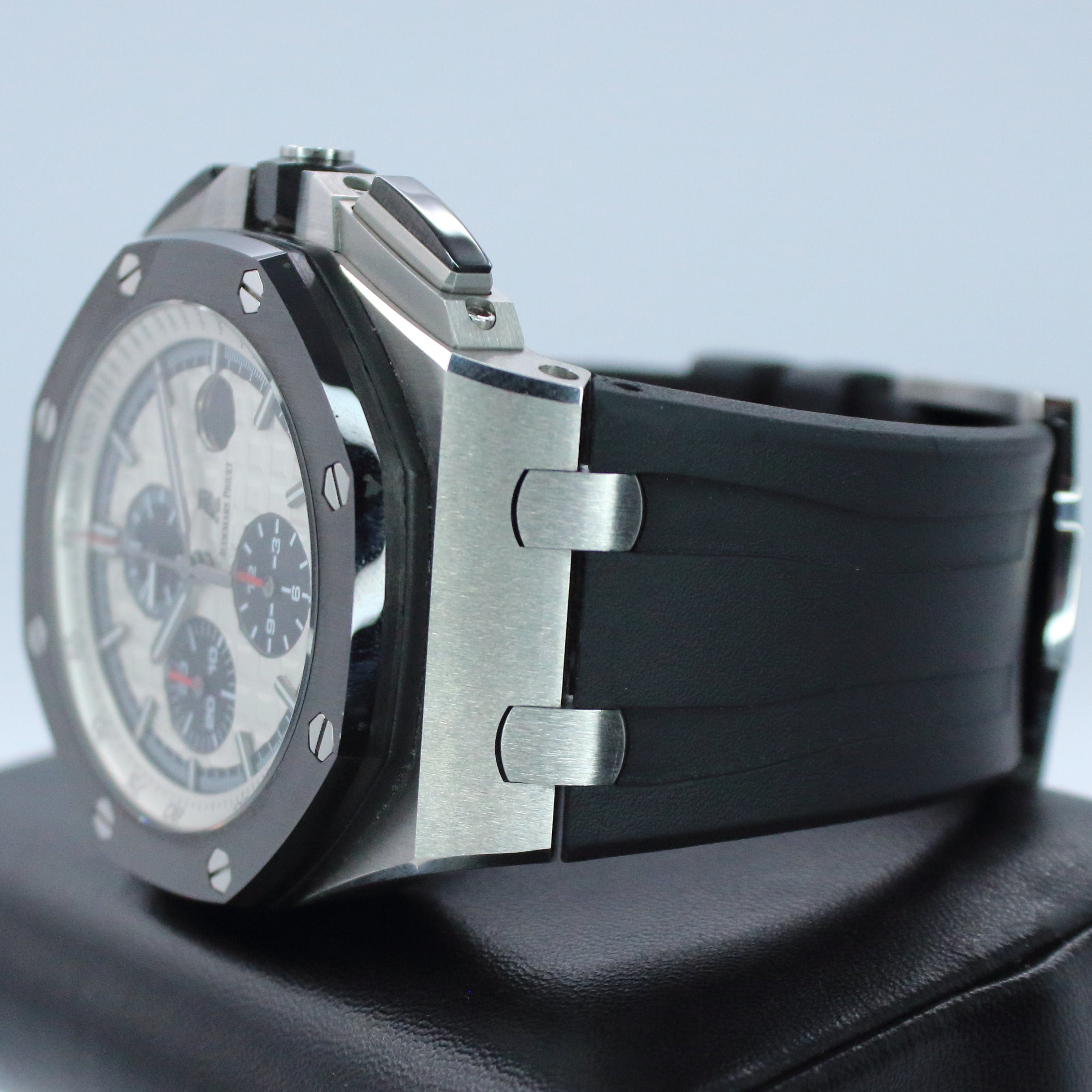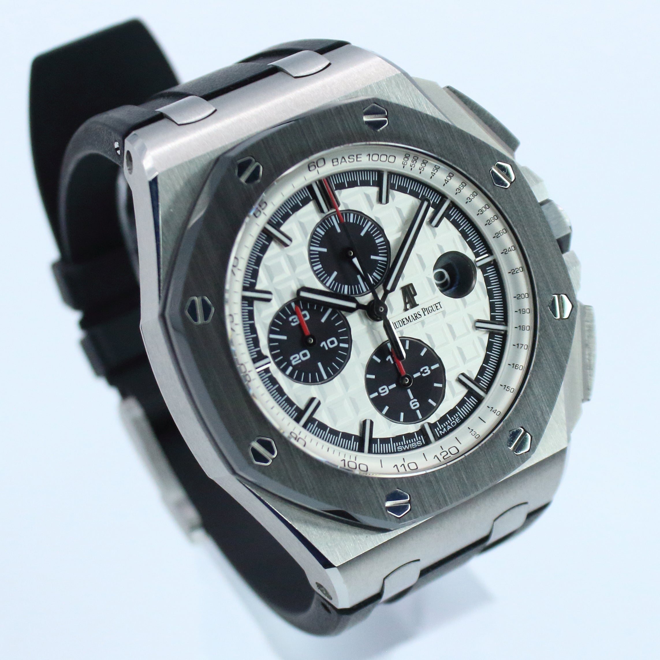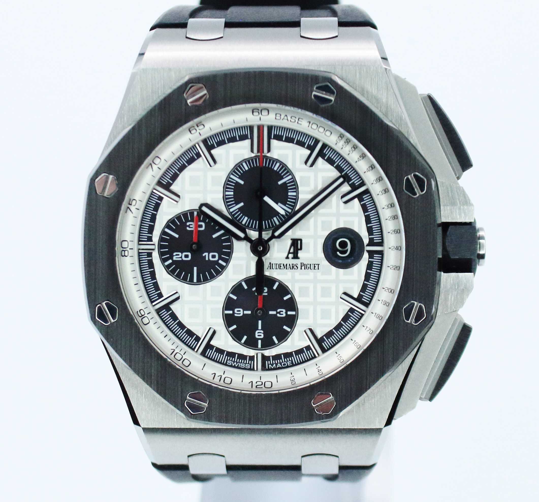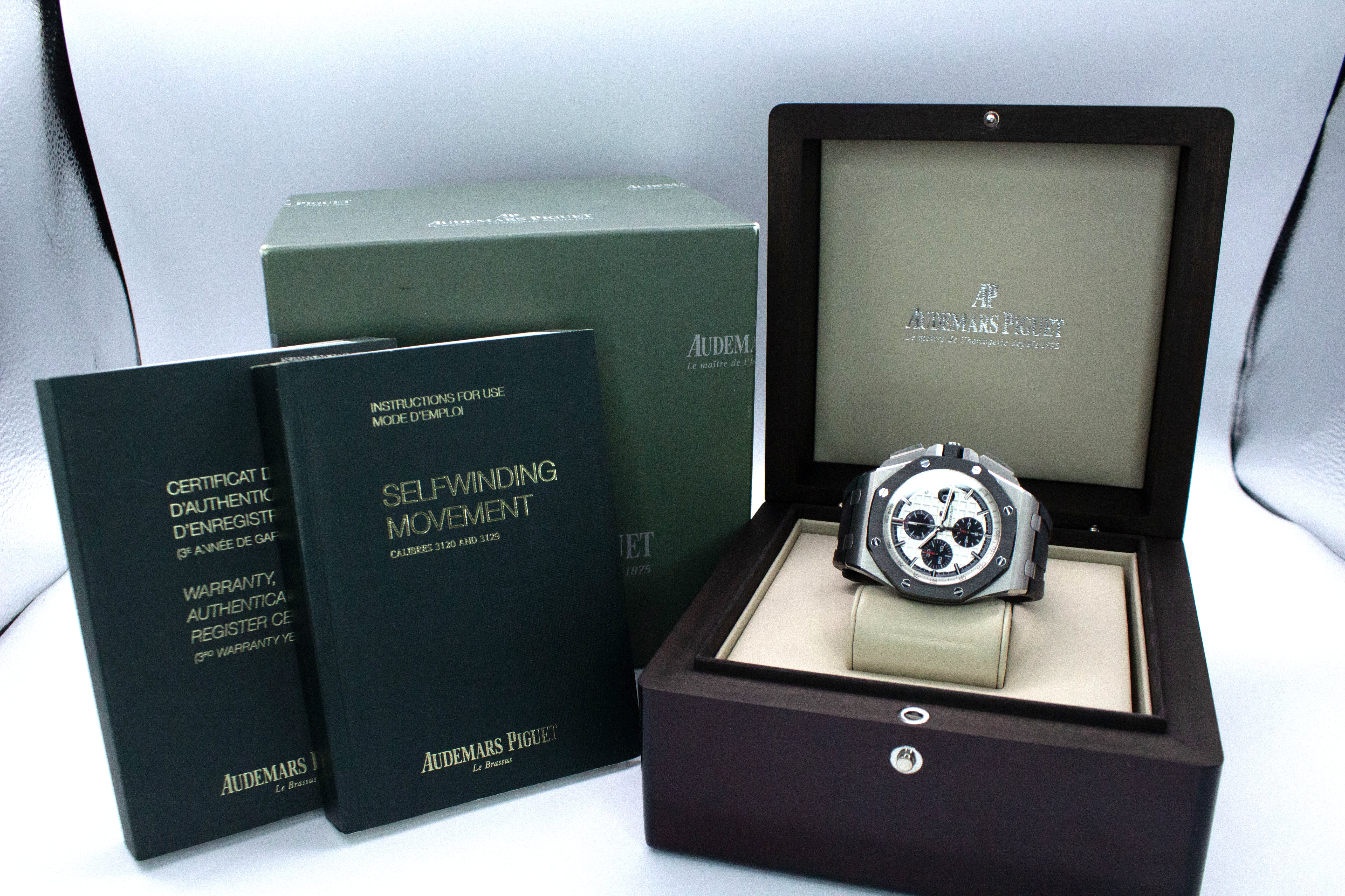 Up for sale is the Audemars Piguet Royal Oak Offshore Chronograph 'Panda' 26400SO.OO.A002CA.01 44MM Steel Silver Dial with fresh service in March 2026, warranty and certificate booklet, instruction booklet, and is double boxed. Watch is dated 2015. MSRP $33,400. It was recently placed on a timegrapher and is running well. All of our watches are photographed under high intensity light with a macro lens. Any flaws will be significantly magnified. The serial numbers have been blurred for privacy. Timepiece is in excellent condition showing little to no signs of wear. Timepiece is located in Indiana.