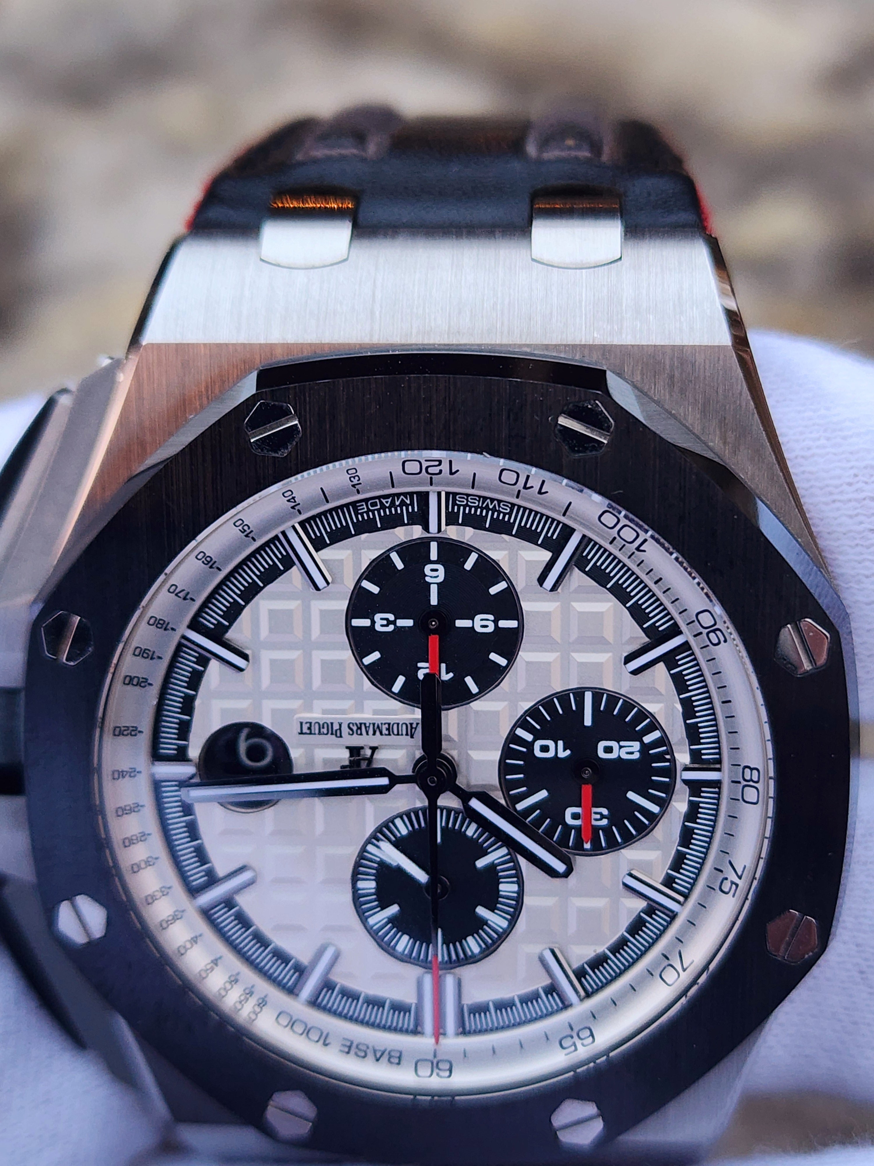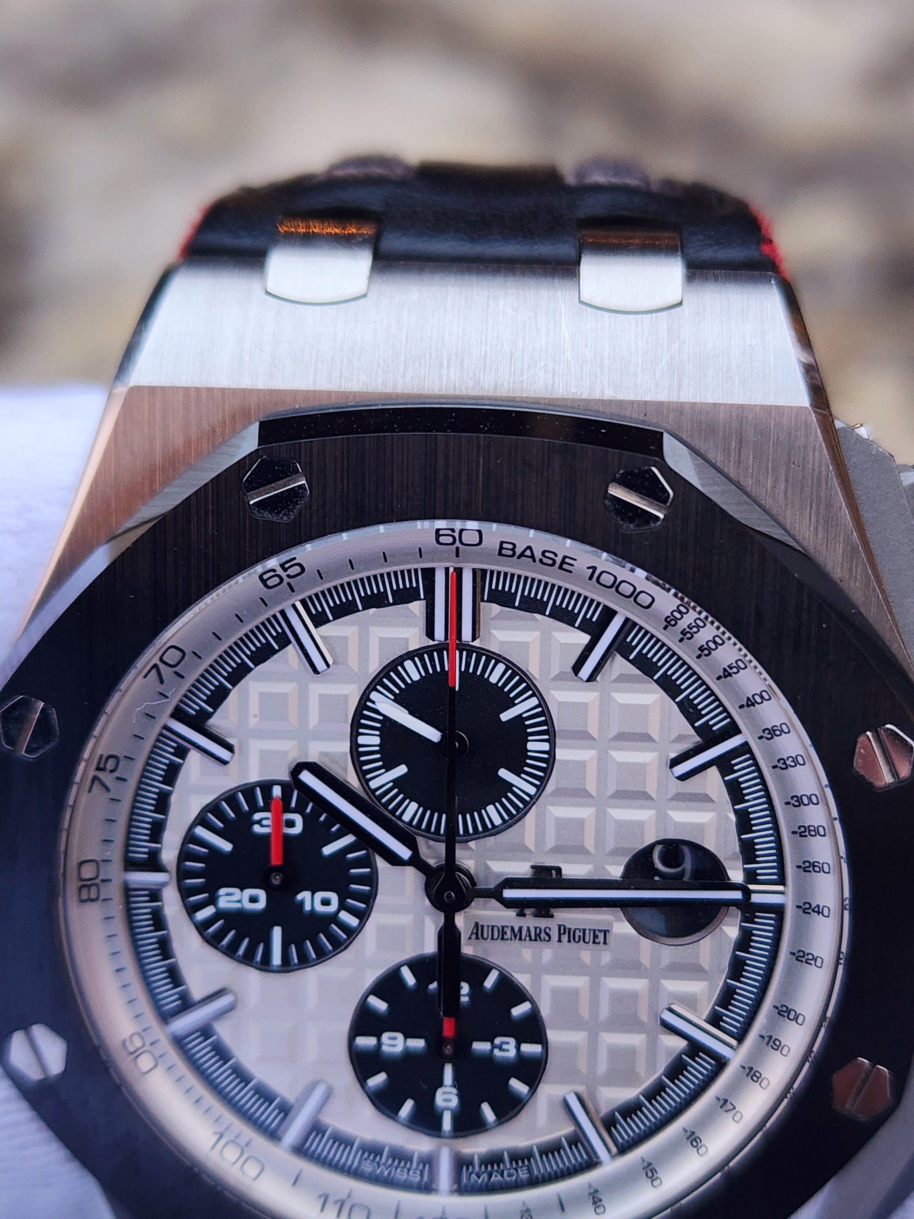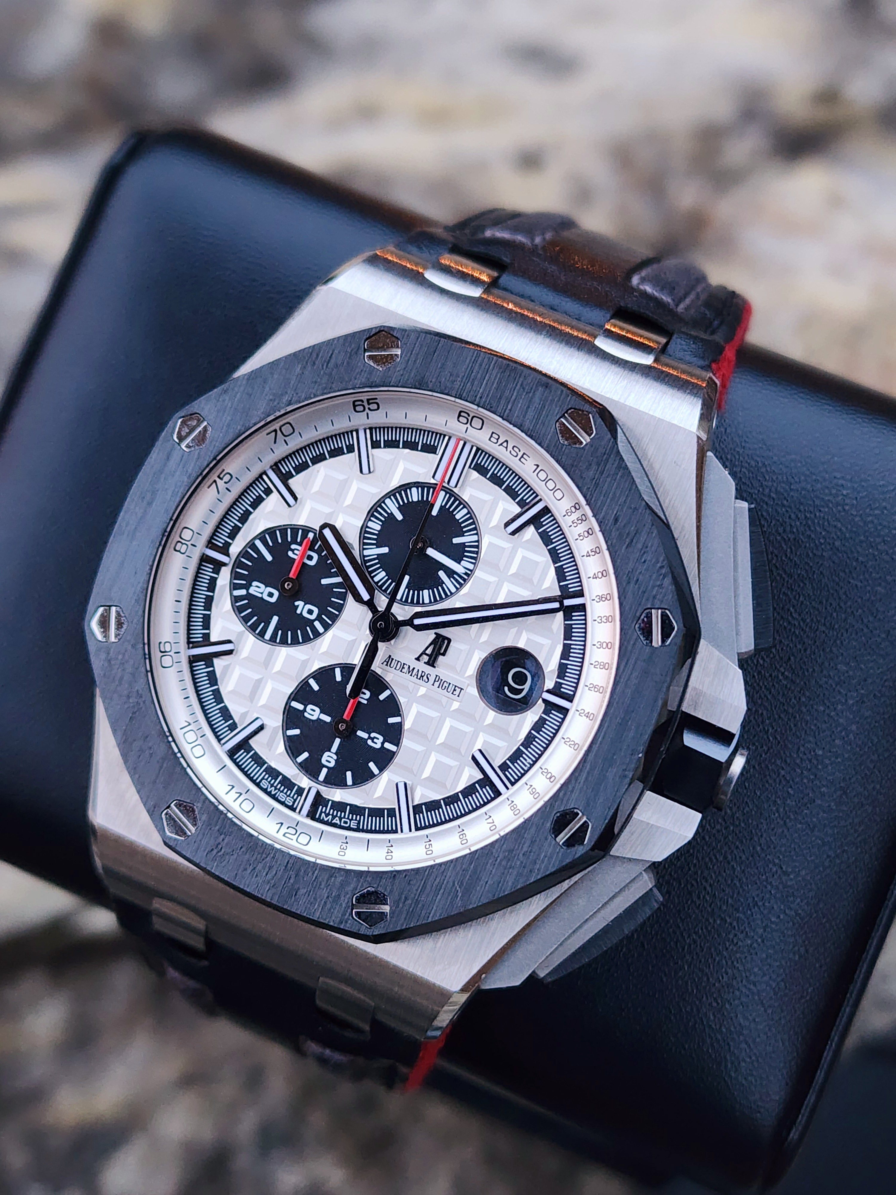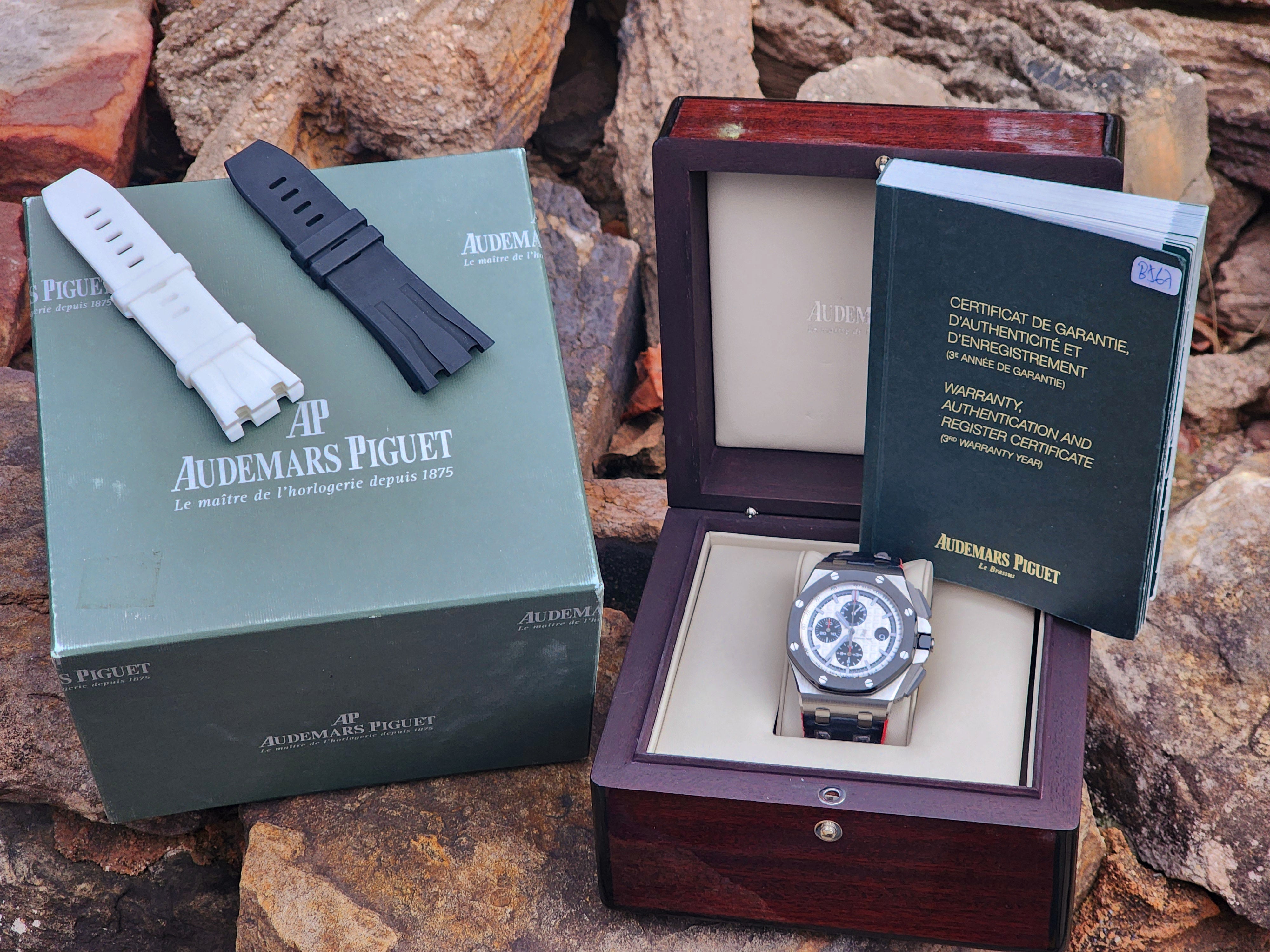Up for sale is the Audemars Piguet Royal Oak Offshore Chronograph White Panda Dial 26400SO.OO.A002CA.01 44mm with AP inner- and outer-box, black rubber AP strap, white rubber Horus strap, Warranty, authentication and register certificate book. Watch is dated 2015. MSRP $33,400. It was recently placed on a timegrapher and is running well. Do excuse the dust/lint in the pictures as all of our watches are photographed outdoors in natural lighting/conditions. The serial numbers have been blurred for privacy. This timepiece is in excellent condition with very minor signs of wear on the case back. The outer-box shows some wear on the inside. This timepiece is located in Indiana.