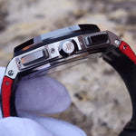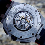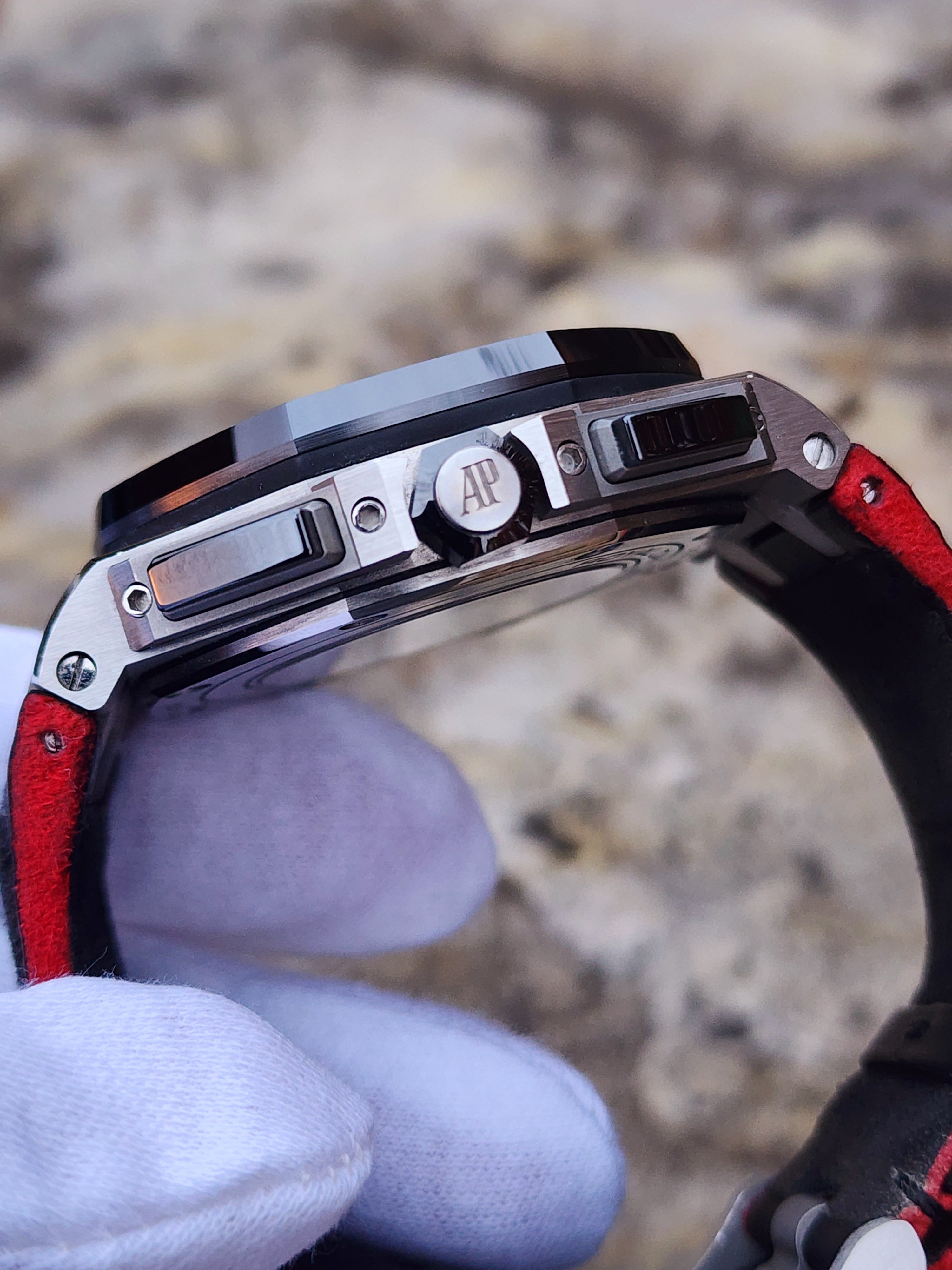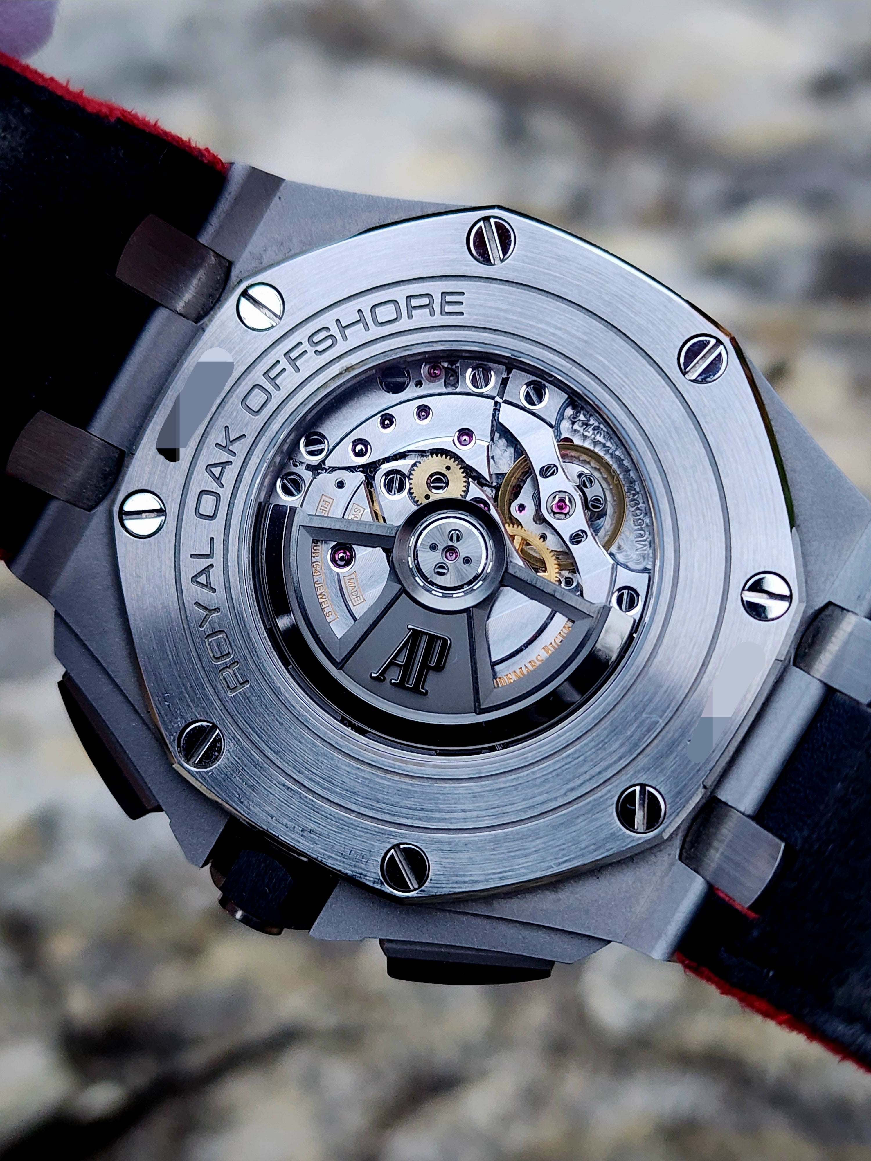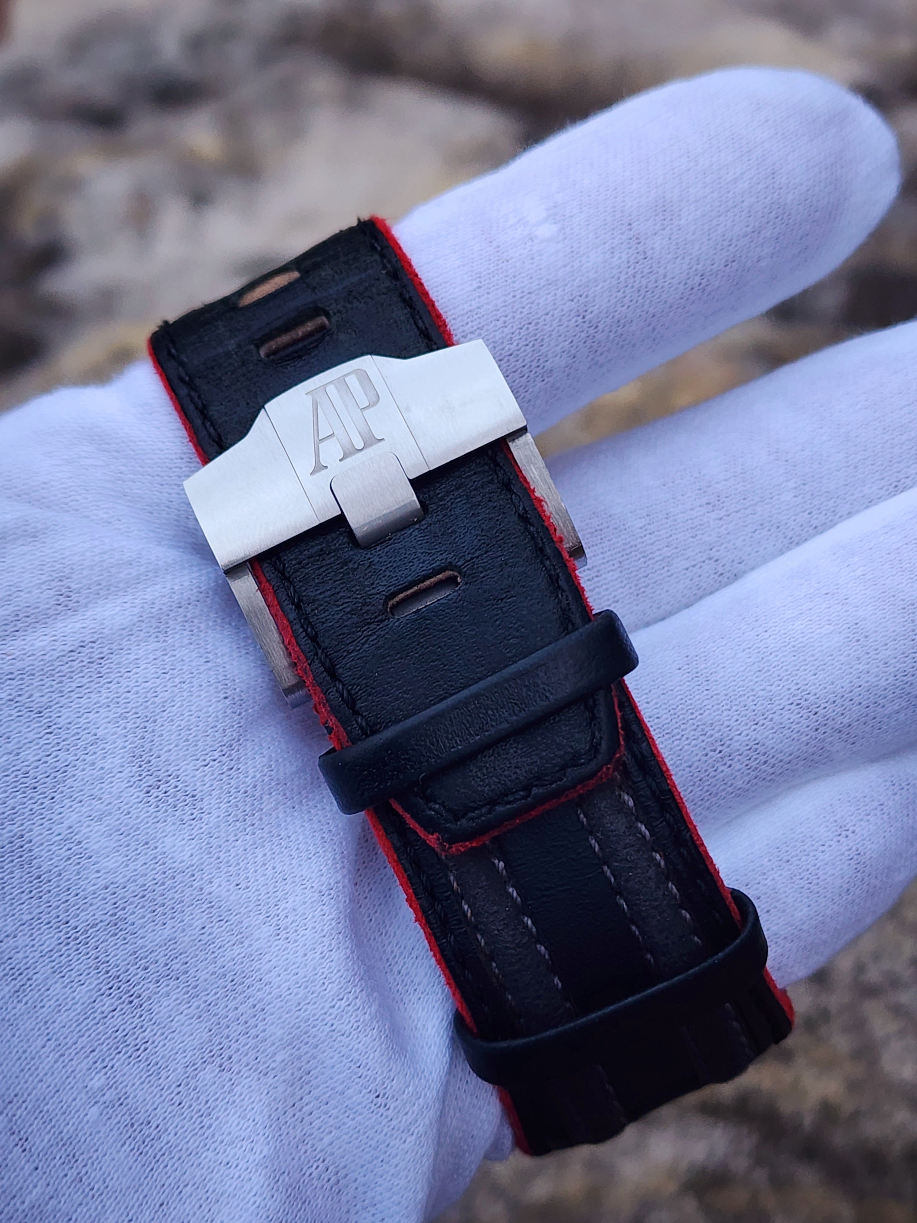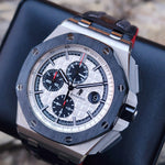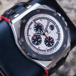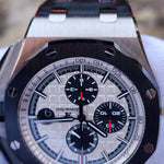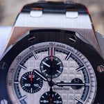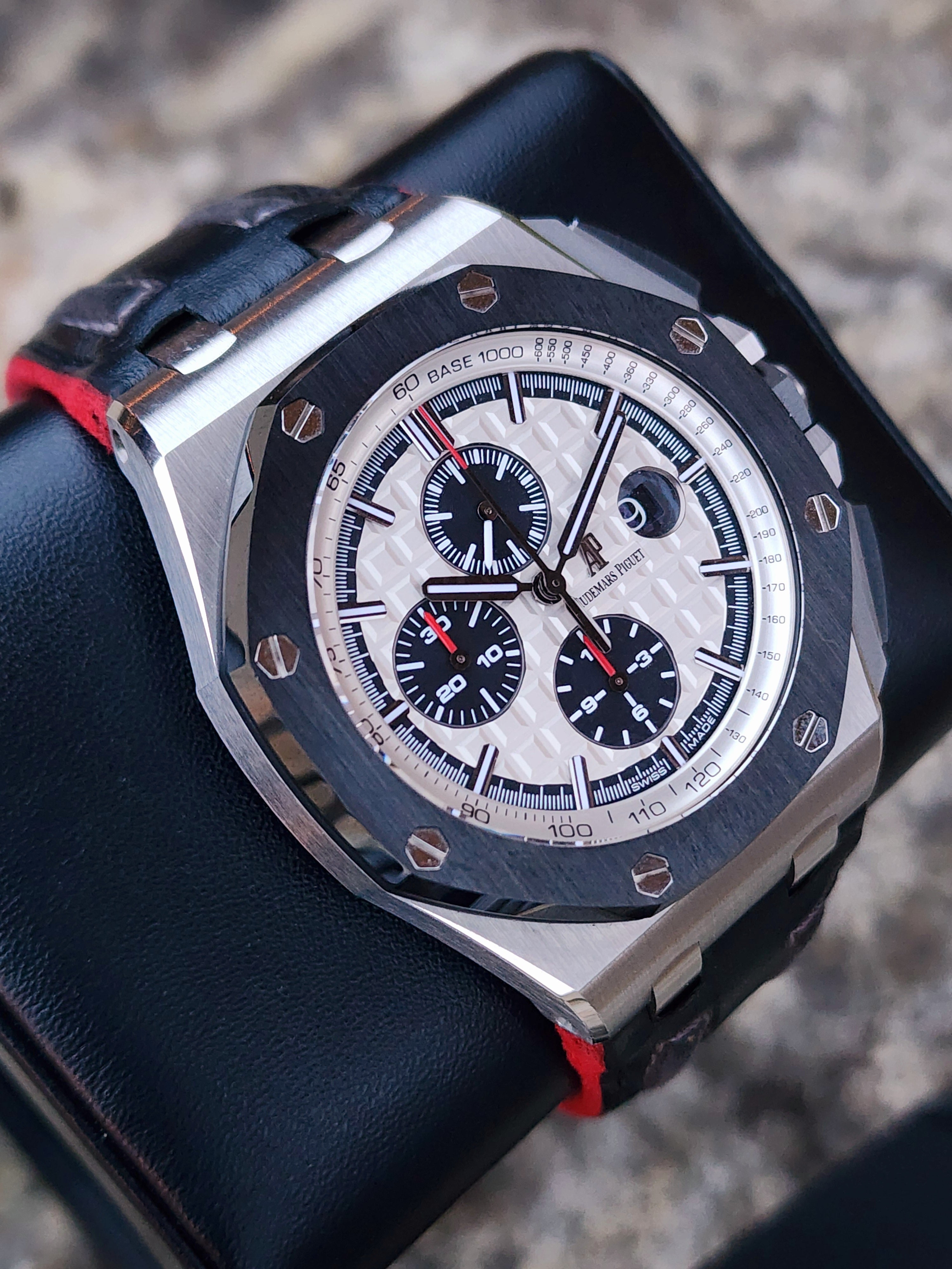 Up for sale is the Audemars Piguet Royal Oak Offshore Chronograph White Panda Dial 26400SO.OO.A002CA.01 44mm with AP inner- and outer-box, black rubber AP strap, white rubber Horus strap, Warranty, authentication and register certificate book. Watch is dated 2015. MSRP $33,400. It was recently placed on a timegrapher and is running well. Do excuse the dust/lint in the pictures as all of our watches are photographed outdoors in natural lighting/conditions. The serial numbers have been blurred for privacy. This timepiece is in excellent condition with very minor signs of wear on the case back. The outer-box shows some wear on the inside. This timepiece is located in Indiana.