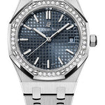 34 mm stainless steel case, 8.8 mm thick, glareproofed sapphire crystal back, bezel set with 40 brilliant-cut diamonds (~0.71 carats), glareproofed sapphire crystal, blue-grey dial with Grande Tapisserie pattern, white gold applied hour-markers and Royal Oak hands with luminescent coating, Calibre 5800 selfwinding movement with hours, minutes, centre seconds and date, approximately 50 hours of power reserve, stainless steel bracelet, AP folding buckle. Water resistant to 50 m.