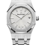 34 mm stainless steel case, 8.8 mm thick, glareproofed sapphire crystal back, glareproofed sapphire crystal, silver-toned dial with Grande Tapisserie pattern, white gold applied hour-markers and Royal Oak hands with luminescent coating, Calibre 5800 selfwinding movement with hours, minutes, centre seconds and date, approximately 50 hours of power reserve, stainless steel bracelet, AP folding buckle. Water resistant to 50 m.