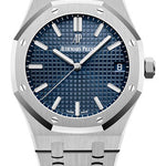 41 mm stainless steel case, 10.4 mm thick, sapphire crystal back, glareproofed sapphire crystal, blue dial with Grande Tapisserie pattern, white gold applied hour-markers and Royal Oak hands with luminescent coating, Calibre 4302 selfwinding movement with hours, minutes, centre seconds and date, approximately 70 hours of power reserve, stainless steel bracelet, AP folding buckle. Water resistant to 50 m.