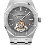 41 mm 950 platinum case, 8.95 mm thick, glareproofed sapphire crystal back, glareproofed sapphire crystal, smoked grey dial with Petite Tapisserie” pattern, white gold applied hour-markers and Royal Oak hands with luminescent coating, Calibre 2924 Manufacture hand-wound movement, approximately 70 hours of power reserve, 950 platinum bracelet, AP folding buckle. Water resistant to 50 meters.
