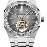 41 mm 950 platinum case, 8.95 mm thick, glareproofed sapphire crystal back, bezel set with baguette-cut diamonds, glareproofed sapphire crystal, smoked grey dial with Petite Tapisserie” pattern, white gold applied hour-markers and Royal Oak hands with luminescent coating, Calibre 2924 Manufacture hand-wound movement, approximately 70 hours of power reserve, 950 platinum bracelet, AP folding buckle. Water resistant to 50 meters.