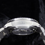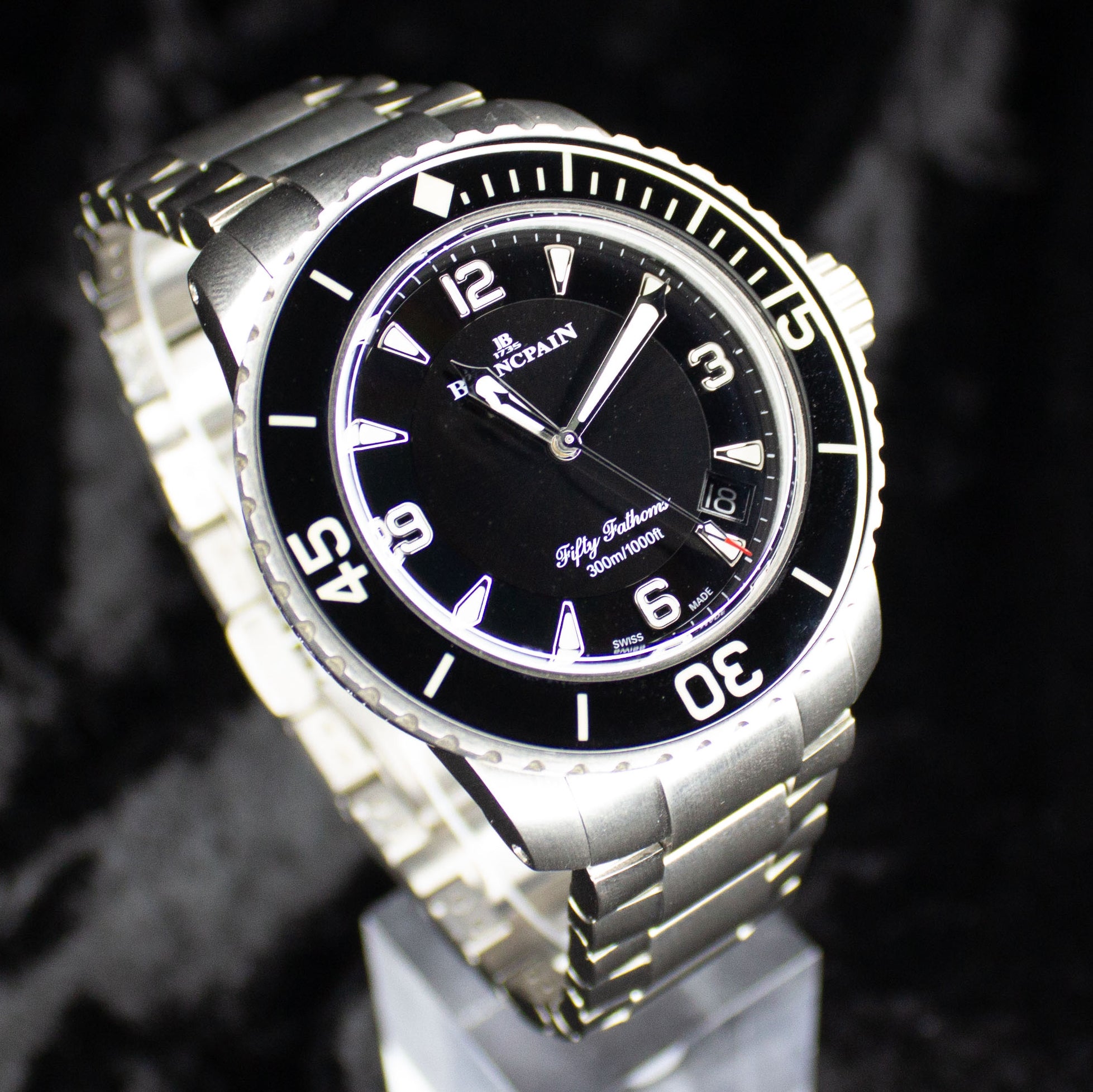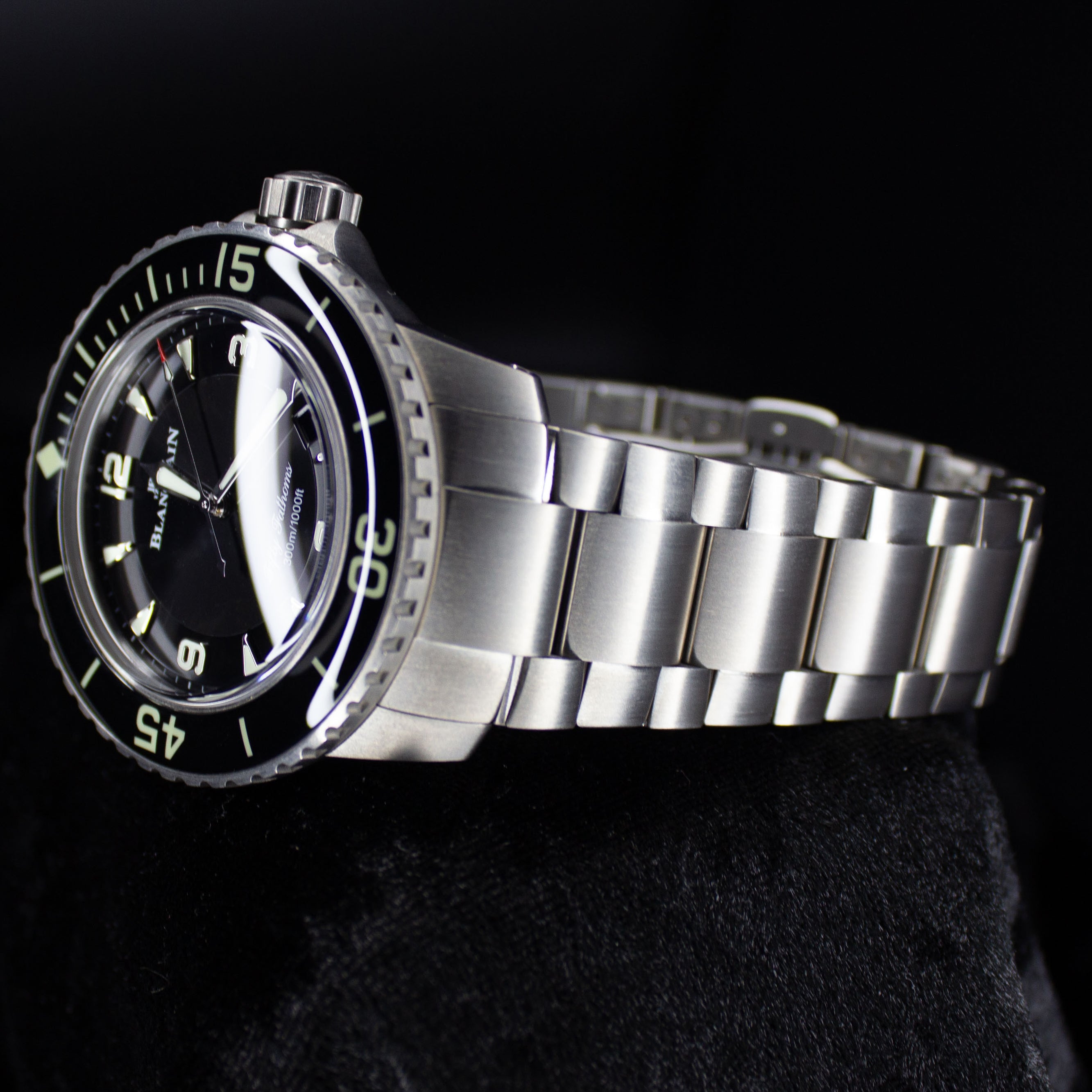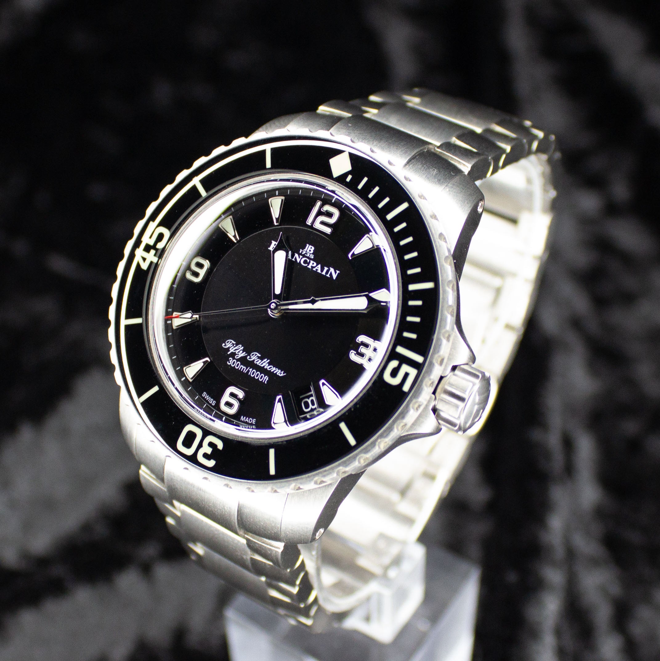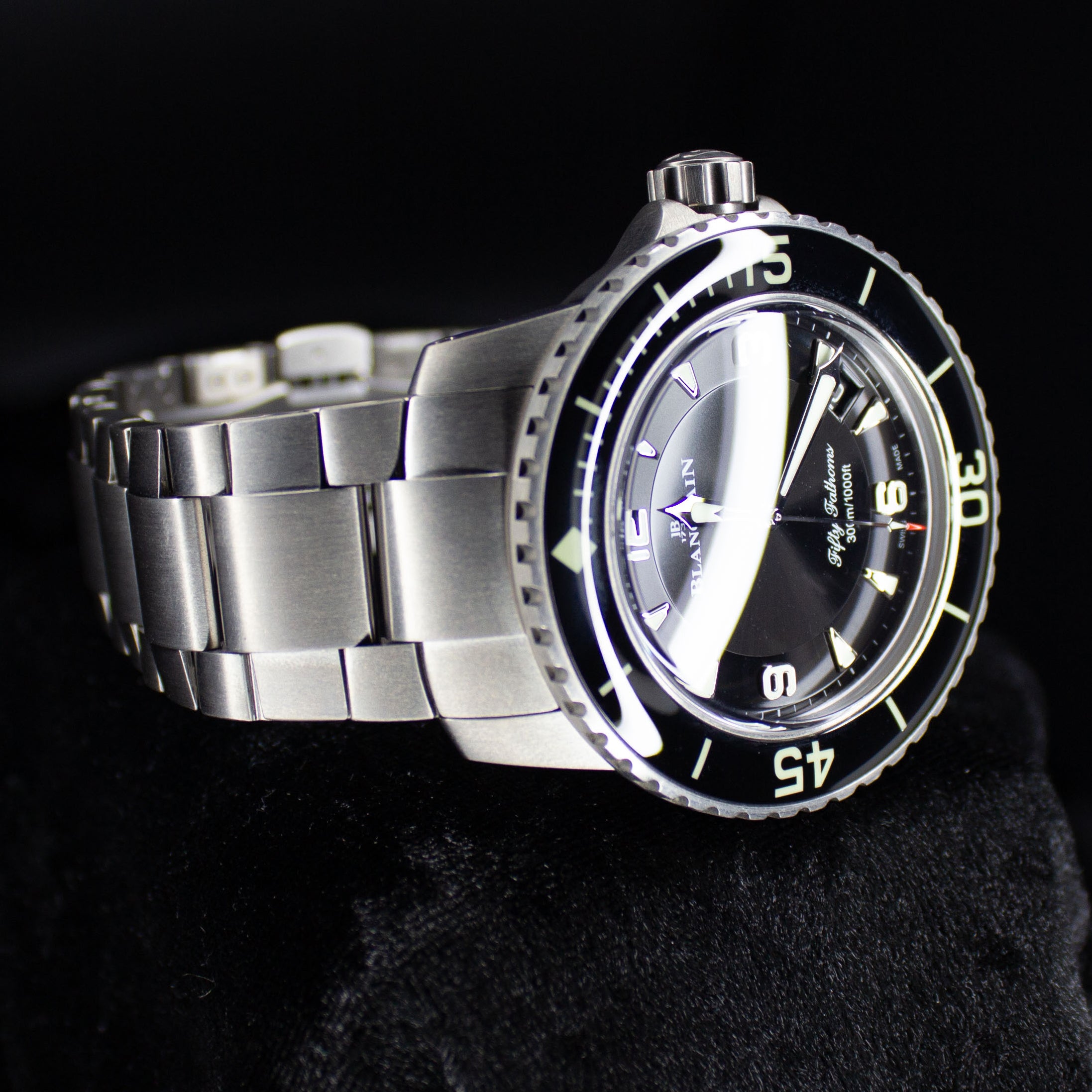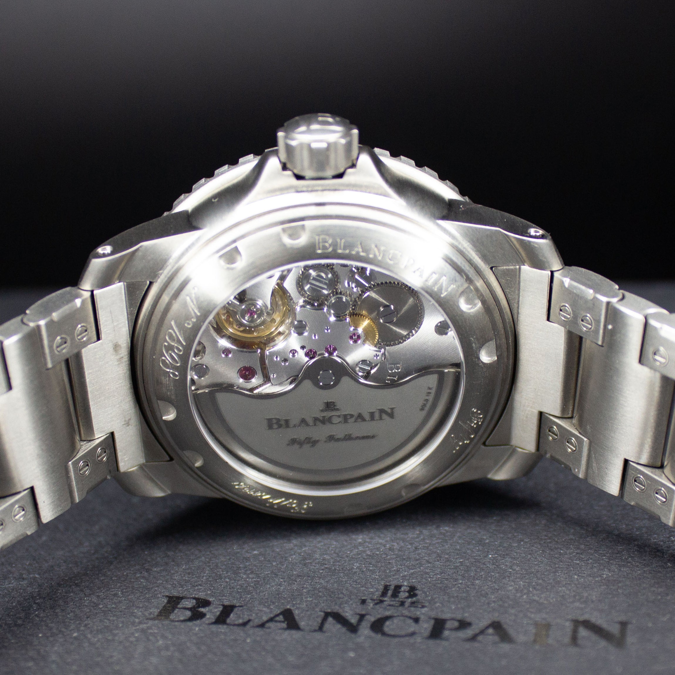 Up for sale is the Blancpain Fifty Fathoms Automatic 5015-12b30-98b 45MM Titanium Black Dial with Warranty card, diver's log book, Blancpain booklet, original purchase receipt, hangtag, and is double boxed. Watch is dated 2022. Watch warranty is good through 2027. MSRP $24,300. It was recently placed on a timegrapher and is running well. All of our watches are photographed under high intensity light with a macro lens. Any flaws will be significantly magnified. The serial numbers have been blurred for privacy. Timepiece is in excellent condition showing little to no signs of wear. Timepiece is located in Indiana.