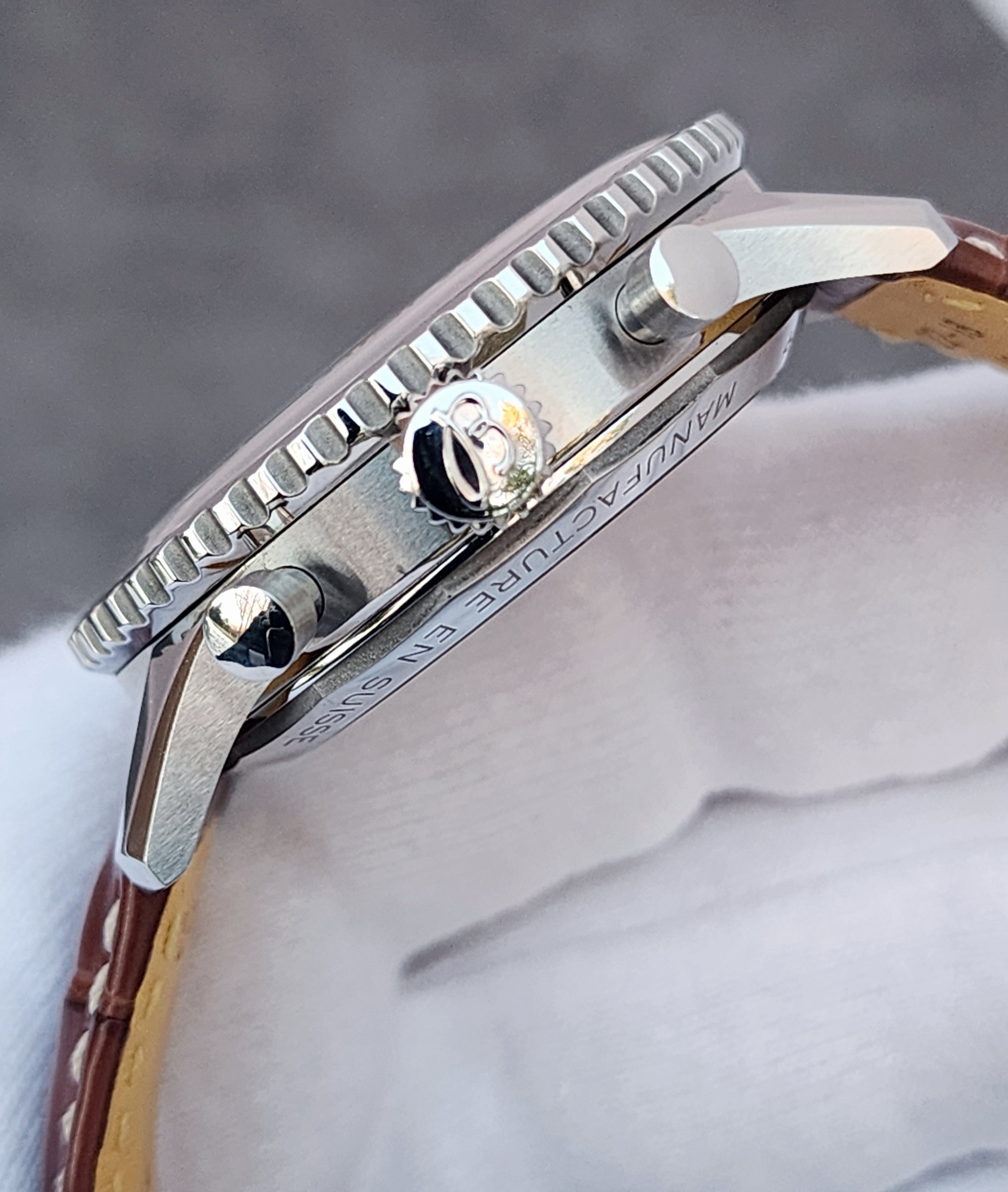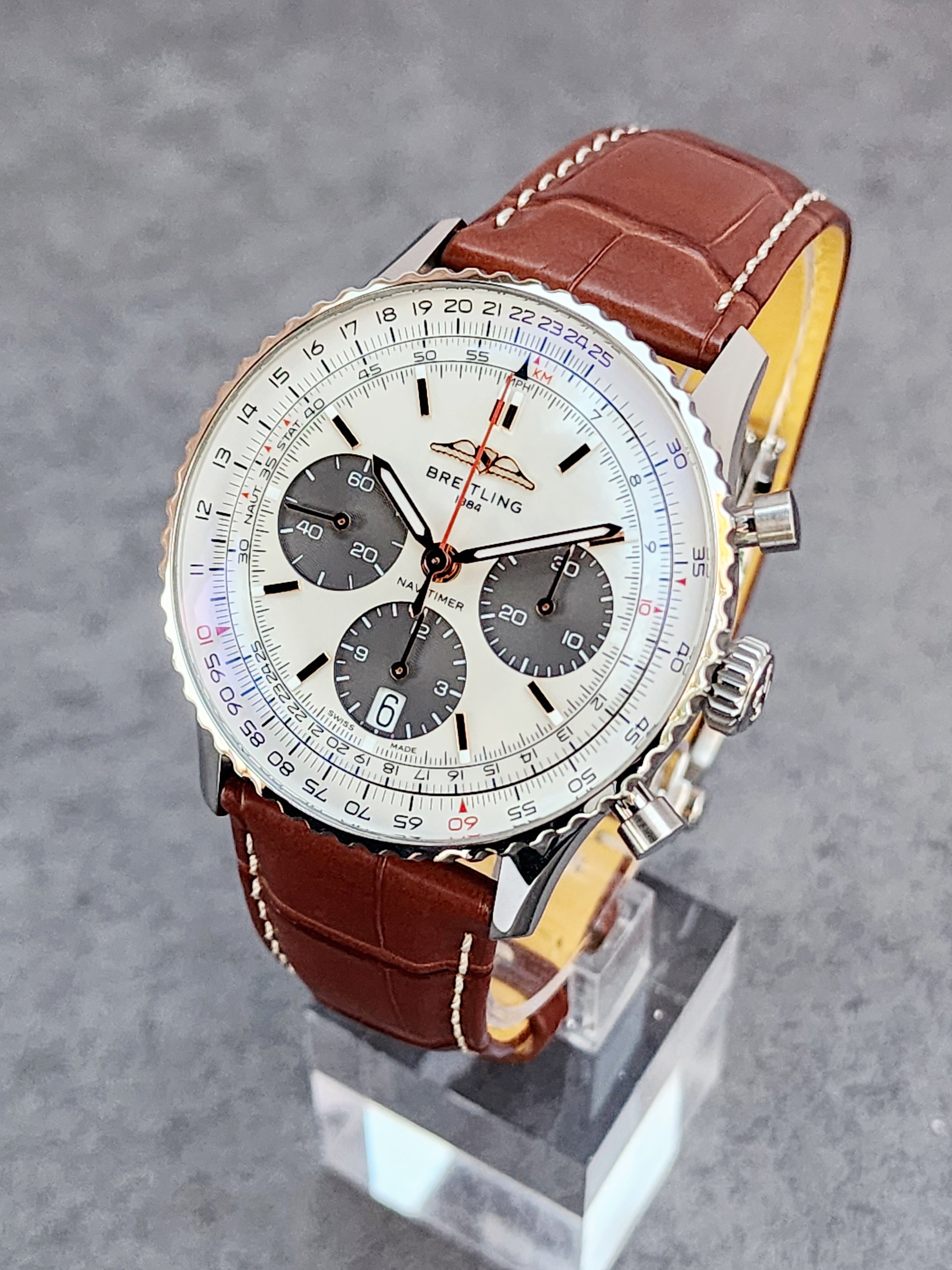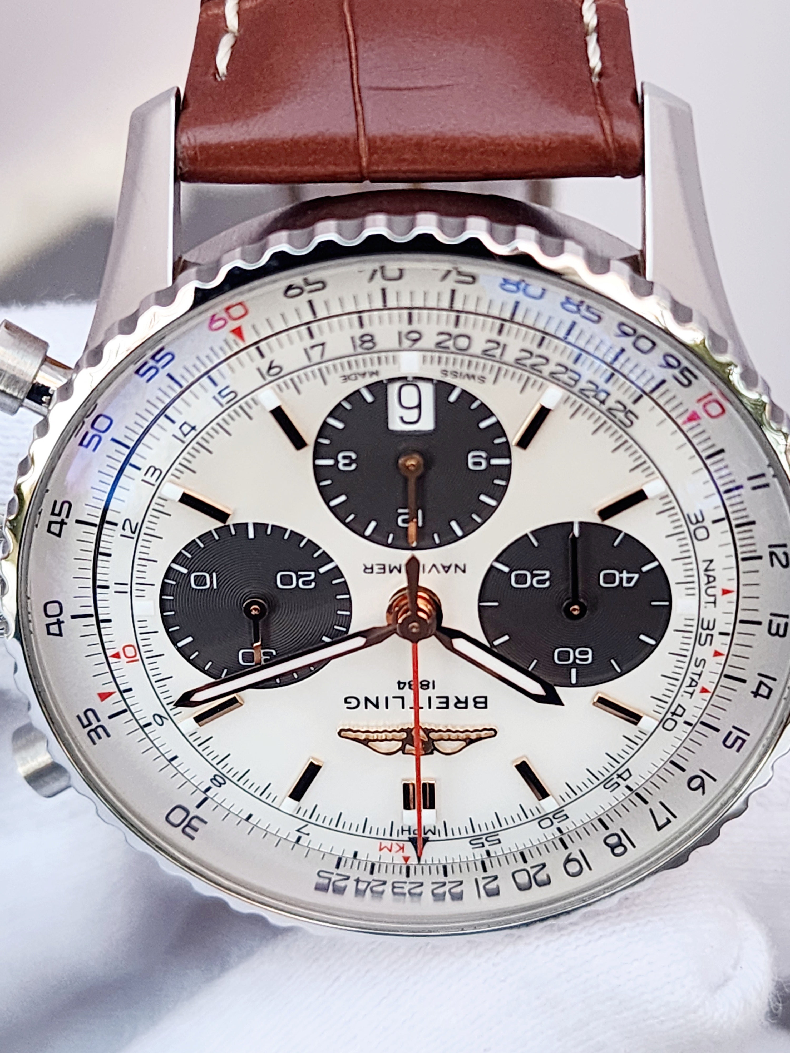 Up for sale is the Breitling Navitimer B01 Chronograph AB0139/AB0139211A1P1 41mm Mother of Pearl Dial Breitling box, Breitling warranty good through 2028, Quick start guide, warranty card holder. Watch is dated 2023. MSRP $9450. It was recently placed on a timegrapher and is running well. All of our watches are photographed under high intensity light with a macro lens. Any flaws will be significantly magnified. The serial numbers have been blurred for privacy.Timepiece is in excellent, pre-owned condition with no signs of wear and is located in Indiana.