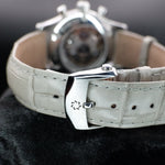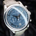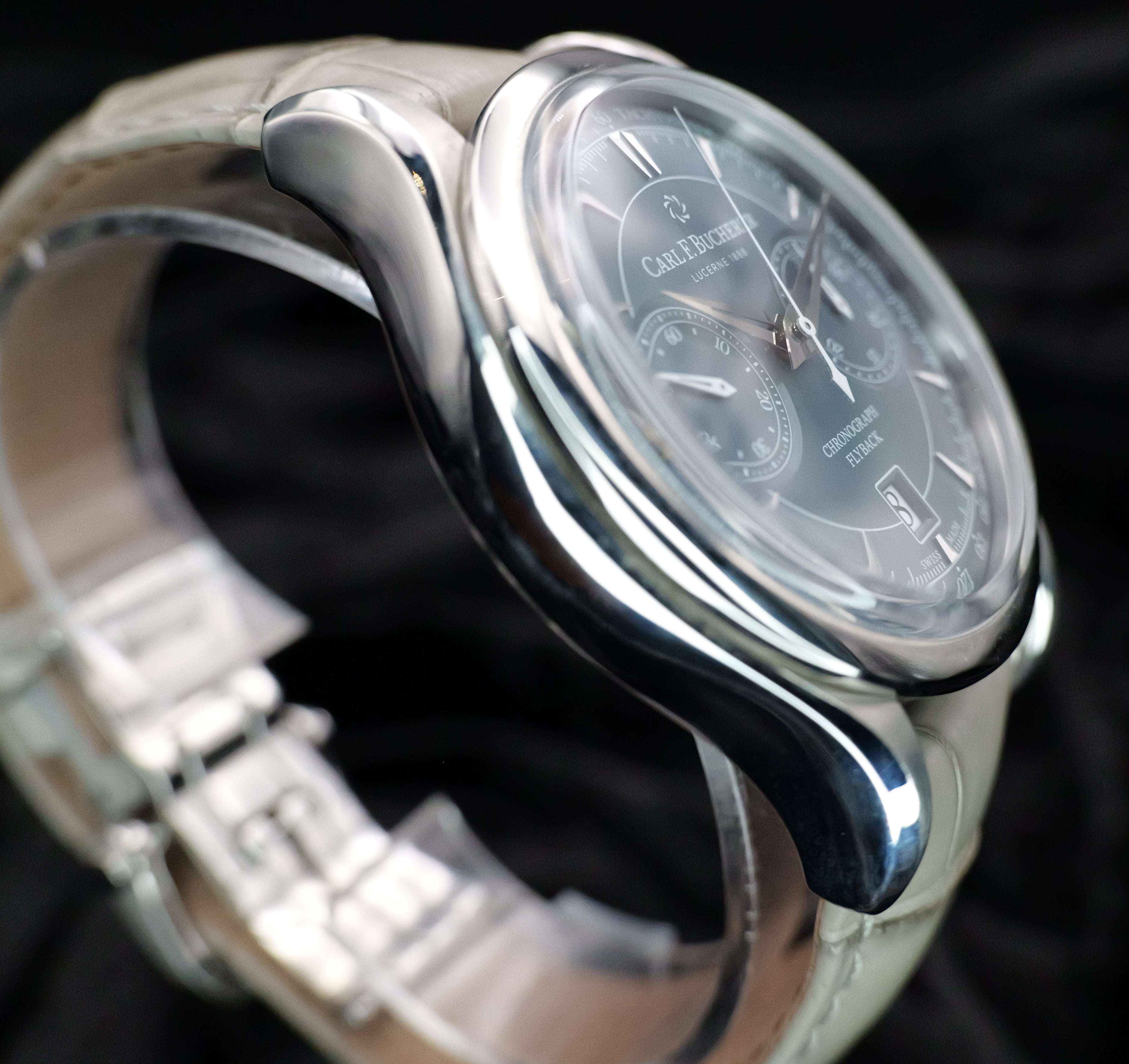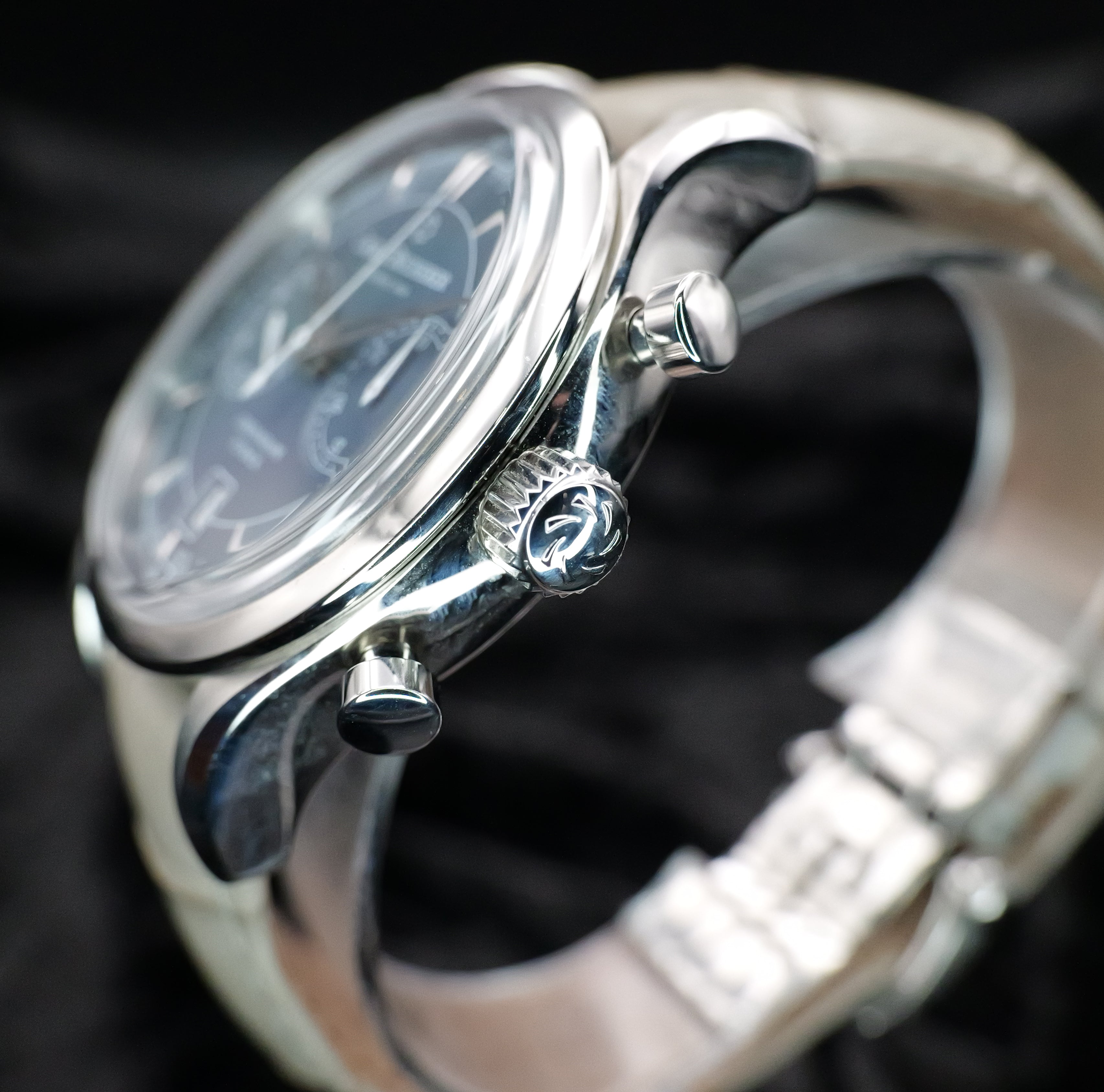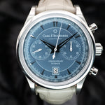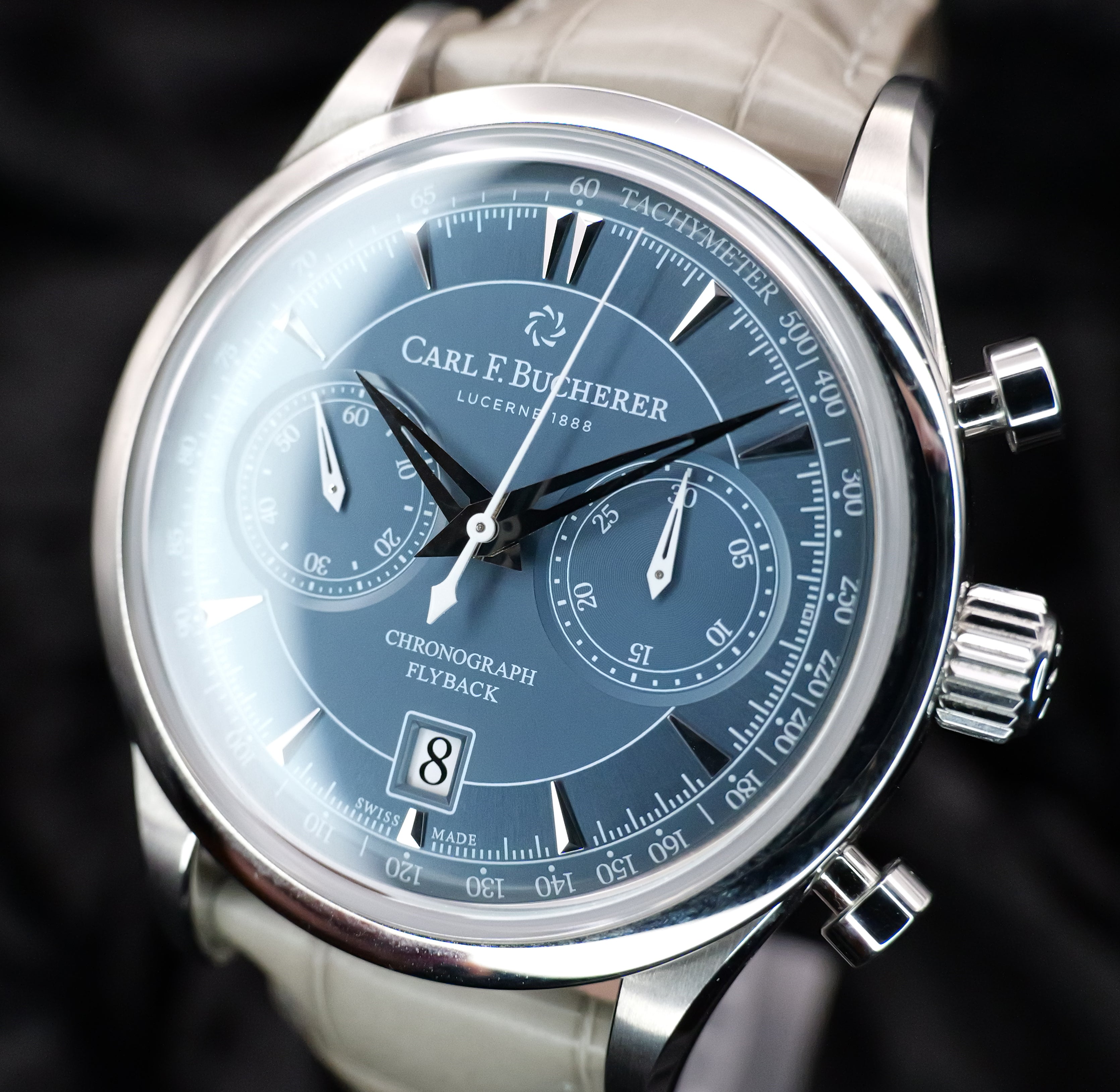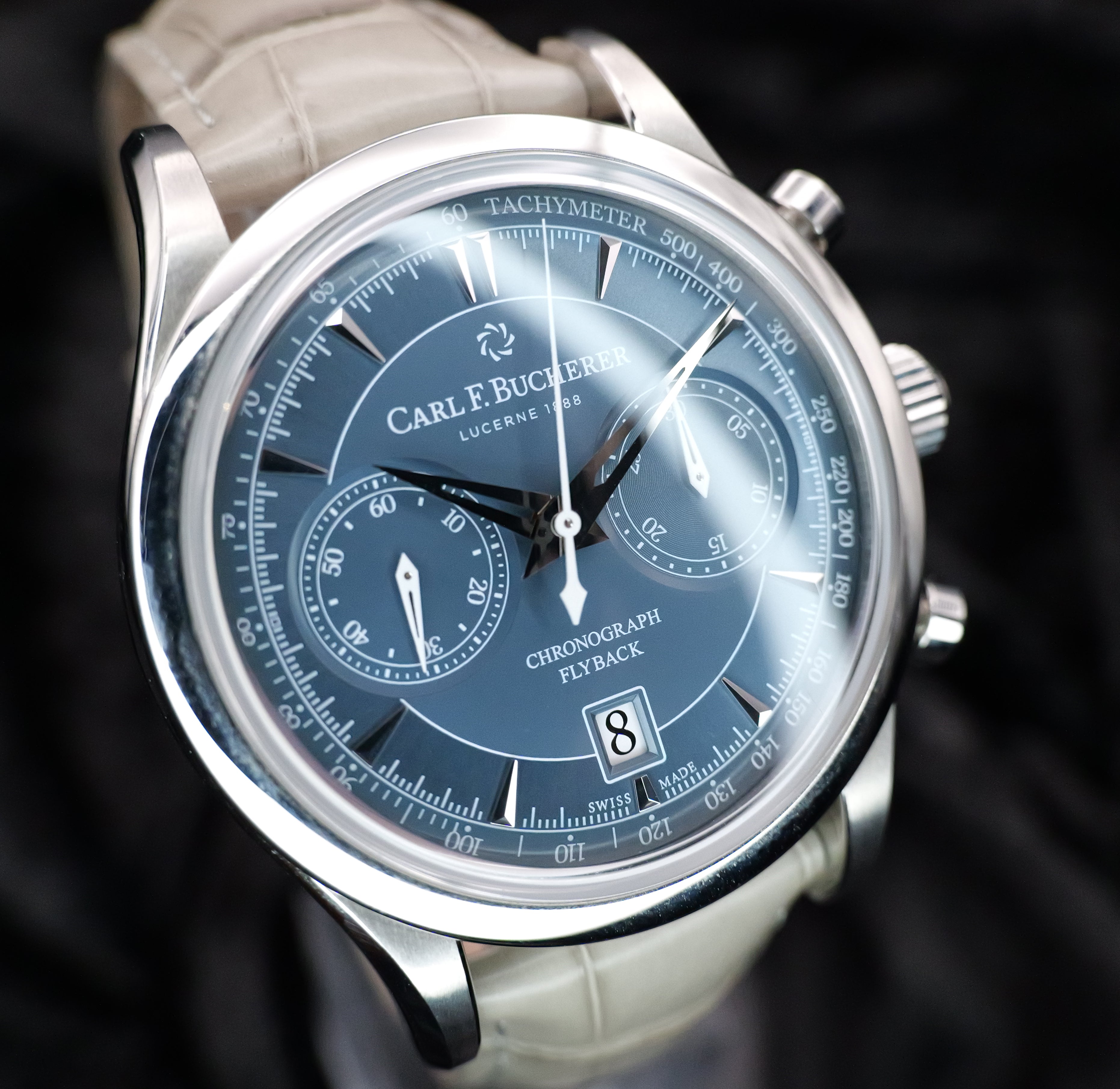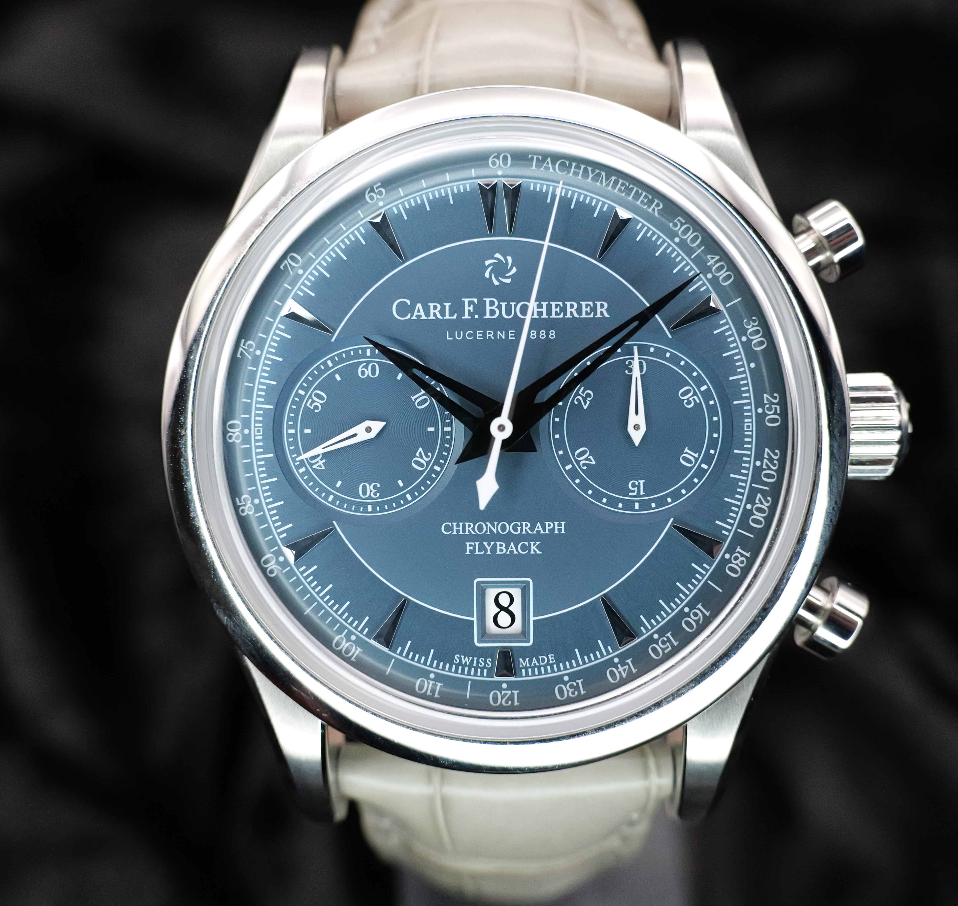 Up for sale is the Carl F. Bucherer Manero Flyback 00.10919.08.93.01 43MM Steel Blue Dial with Instruction booklet, open warranty registration card, microfiber cloth, and is double boxed. MSRP $7,400. It was recently placed on a timegrapher and is running well. All of our watches are photographed under high intensity light with a macro lens. Any flaws will be significantly magnified. The serial numbers have been blurred for privacy. Timepiece is in excellent condition showing little to no signs of wear. Timepiece is located in Indiana.