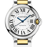 36 mm steel case, 12.1 mm thick, fluted 18K yellow gold crown set with a synthetic cabochon-shaped spinel, sapphire crystal, silvered guilloche dial, automatic movement, interchangeable two-tone bracelet. Water resistant to 3 bar (approx 30 metres).