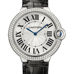 40mm 18K rhodium-finish white gold case brilliant-cut diamonds, 6.9mm thick, sapphire back, fluted crown set with a blue cabochon-shaped sapphire, 18K rhodium-finish white gold bezel set with brilliant-cut diamonds, sapphire crystal, silver dial with sunray effect, caliber 430 MC manual-winding movement with blue cabochon-shaped sapphire, black alligator skin strap, folding buckle. Water resistant to 30 meters.