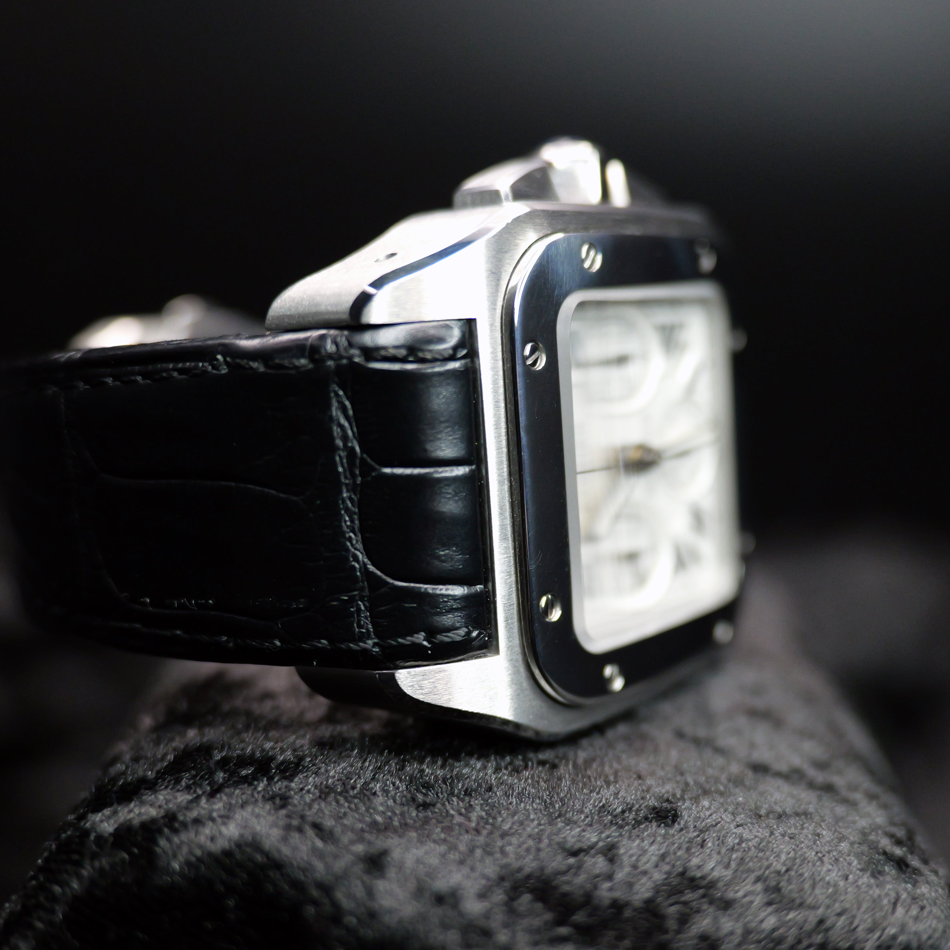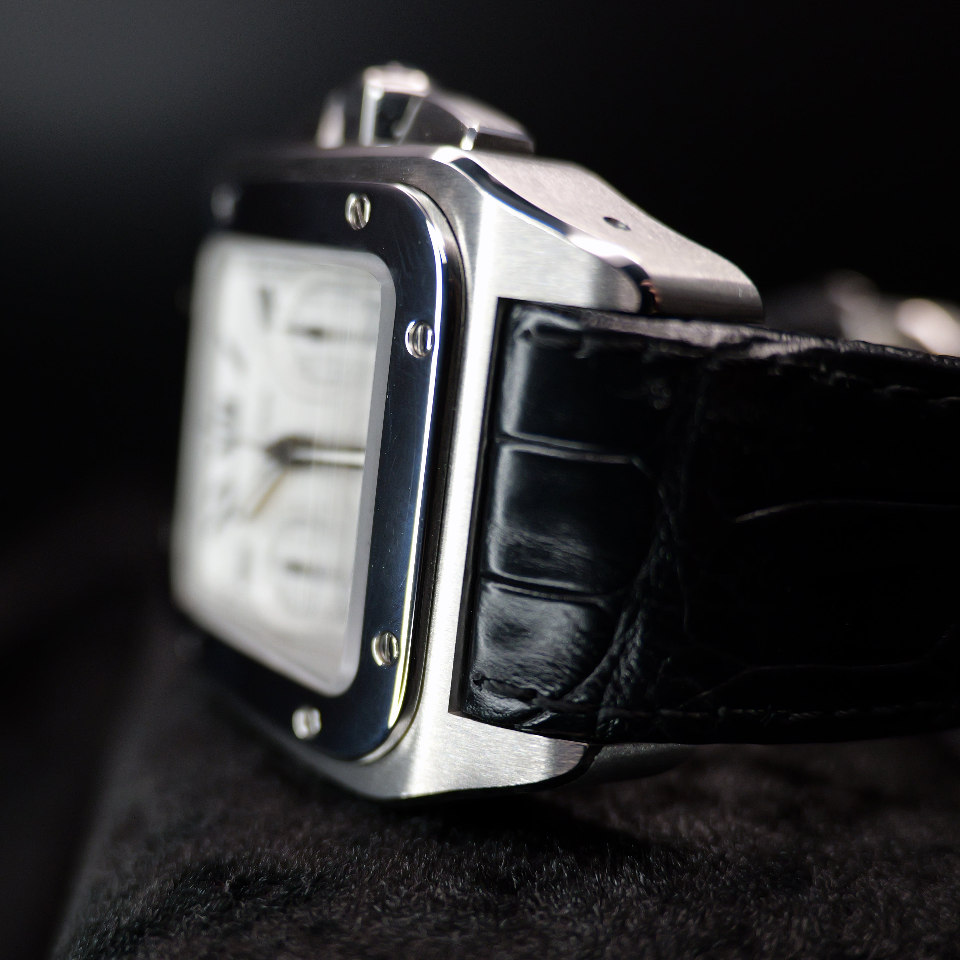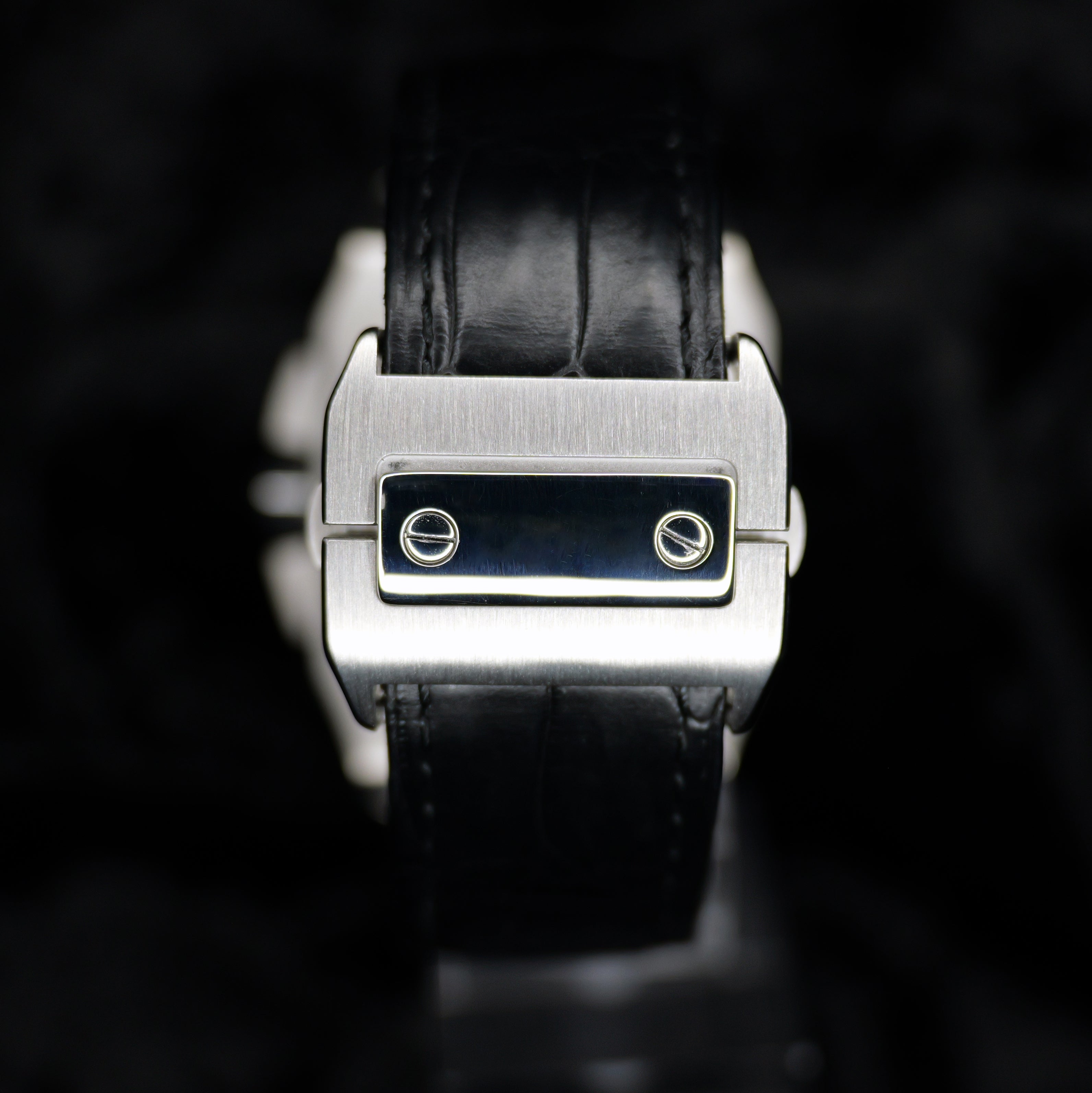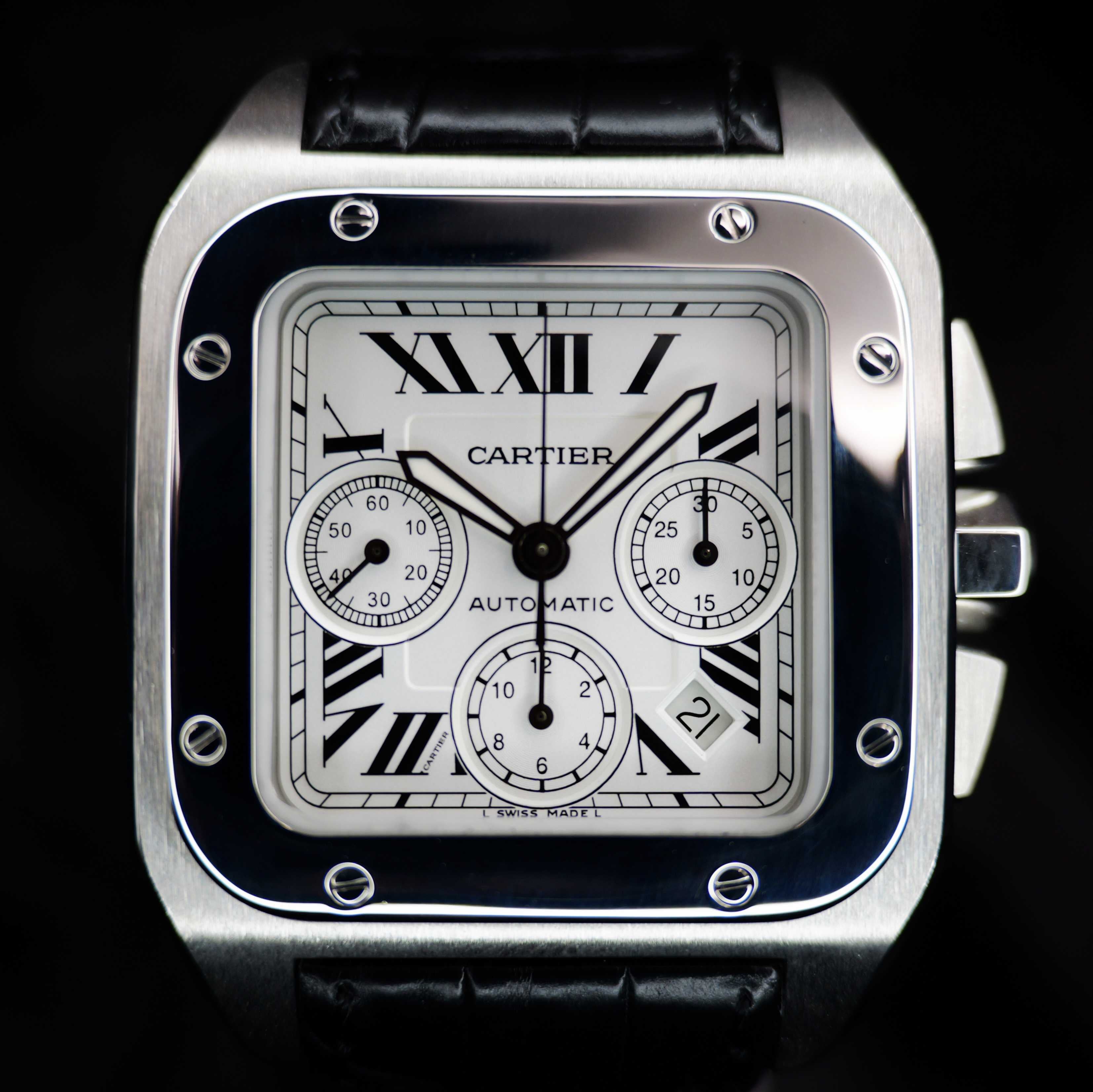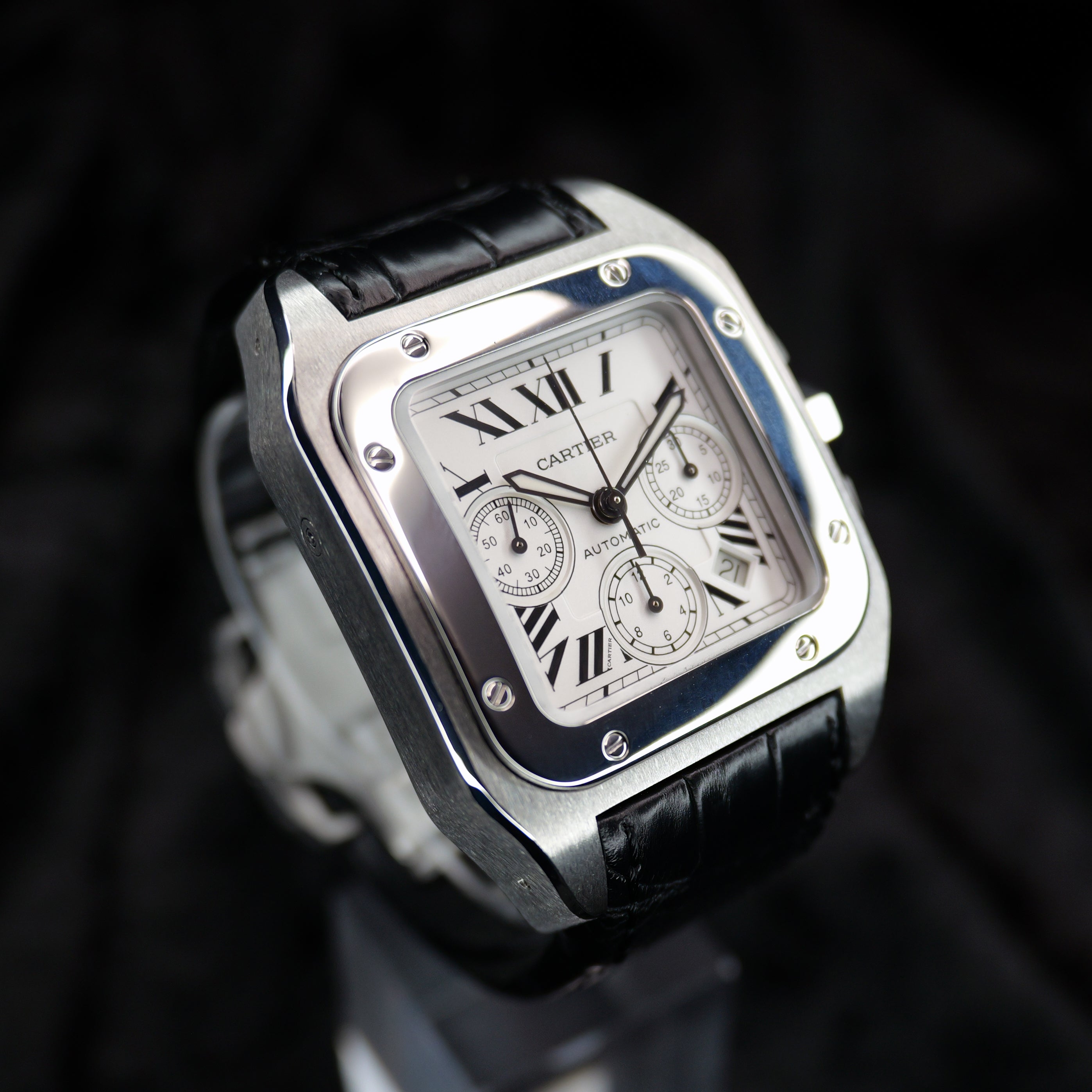 Up for sale is the Cartier Santos 100 XL Chronograph W20090X8 42MM White Dial. MSRP $9,000. It was recently placed on a timegrapher and is running well. All of our watches are photographed under high intensity light with a macro lens. Any flaws will be significantly magnified. The serial numbers have been blurred for privacy. Timepiece is in excellent condition showing little to no signs of wear. Timepiece is located in Indiana.