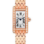 27mm x 15.2mm 18K pink gold case set with brilliant-cut diamonds, 6.5mm thick, sapphire back, octagonal crown set with a brilliant-cut diamond, 18K pink gold bezel set with brilliant-cut diamonds, sapphire crystal, silver dial set with brilliant-cut diamonds, quartz movement with blued-steel sword-shaped hands, 18K pink gold bracelet. Water resistant to 3 bar.