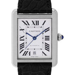 31 x 40.85 mm by 7.65 mm thick stainless steel case, beaded crown set with a synthetic spinel cabochon, sapphire crystal, silver dial with 12 Roman numerals and blued steel hands, caliber Cartier 049 automatic movement, black alligator strap, buckle double deployant. Water resistant to 30 meters.