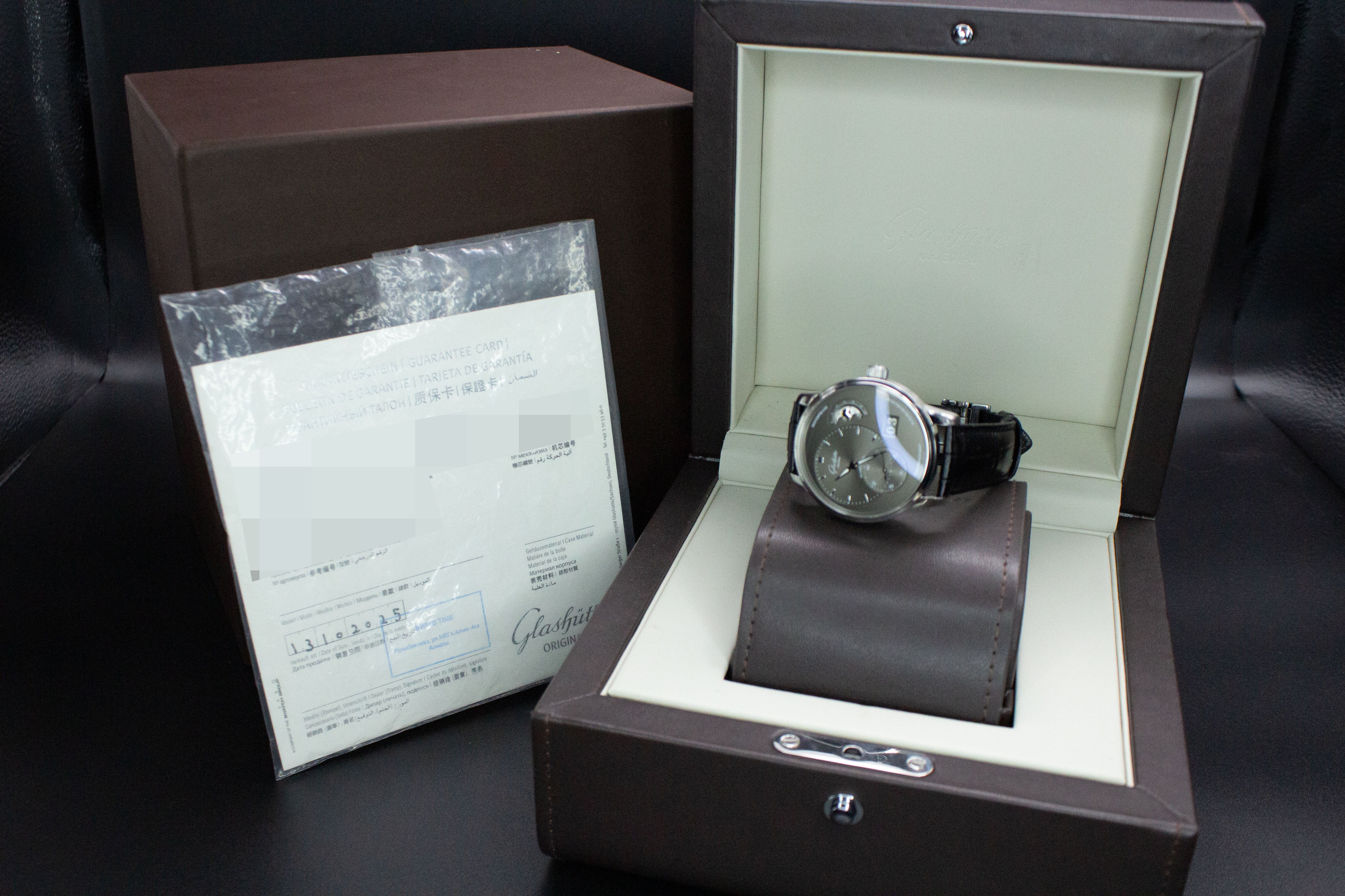 Up for sale is the Glashutte Original PanoMaticLunar 1-90-02-43-32-05 40MM Steel Grey Dial with Warranty card and is double boxed. Watch is dated 2025. Watch warranty is good through 13/10/2027. MSRP $13,400. It was recently placed on a timegrapher and is running well. All of our watches are photographed under high intensity light with a macro lens. Any flaws will be significantly magnified. The serial numbers have been blurred for privacy. Timepiece is in excellent condition showing little to no signs of wear. Timepiece is located in Indiana.