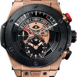 45 mm polished and satin-finished 18K King Gold case, polished and satin-finished black ceramic bezel, black composite resin lower bezel with 6 H-shaped black PVD titanium screws, sapphire crystal with anti-reflective treatment, mat and satin-finished black dial with red retrograde chronograph minute hand, white retrograde chronograph second hand, satin-finished and microblasted gold-plated minute-hour-small second hands, white luminescent, HUB1261 UNICO manufacture self-winding bi-retrograde movement with central chronograph and column wheel, approximately 72 hours of power reserve, black structured lined rubber strap, black PVD titanium deployant buckle with 18K King Gold insert. Water resistant to 100 meters.